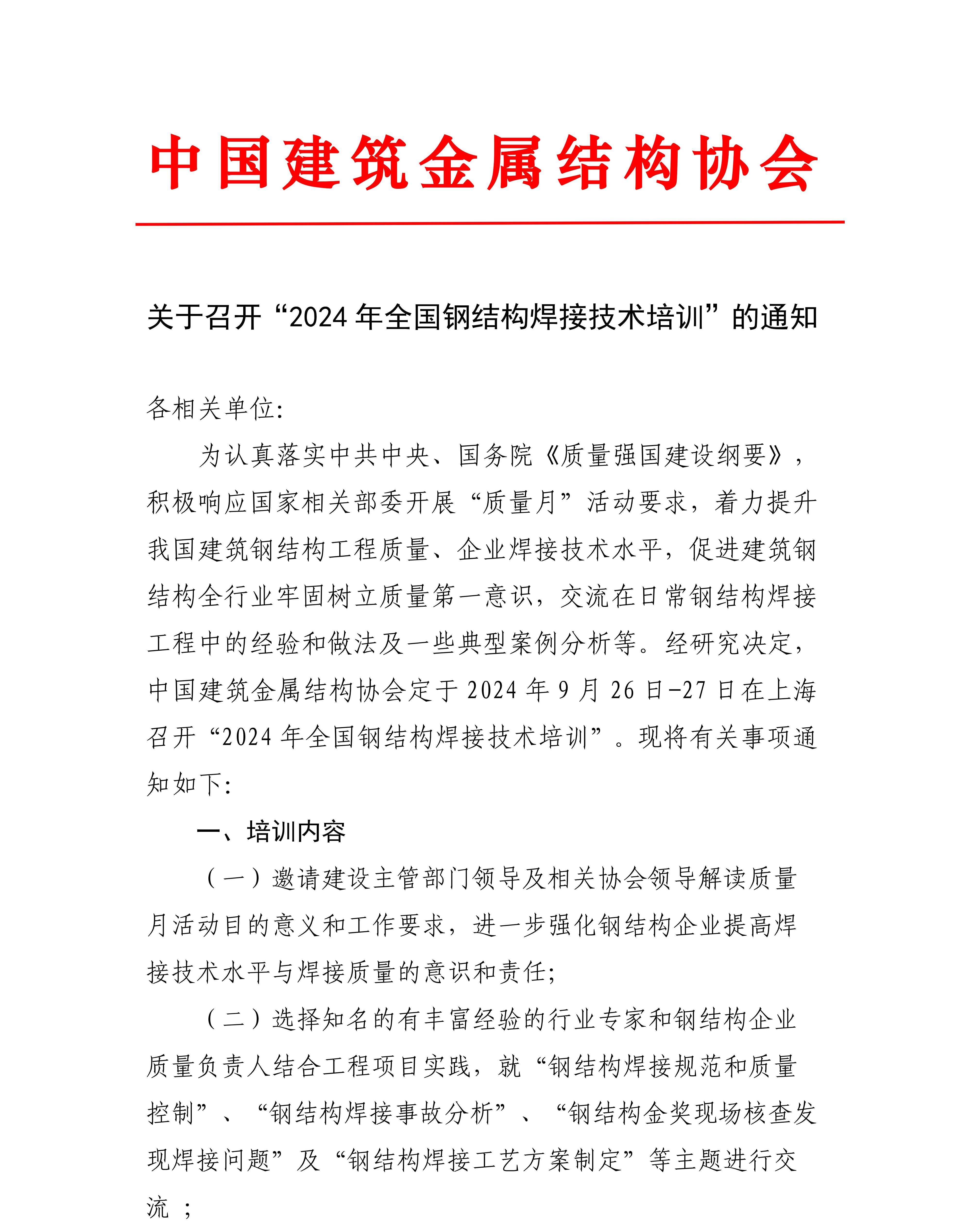 关于召开“2024年全国钢结构焊接技术培训”的通知