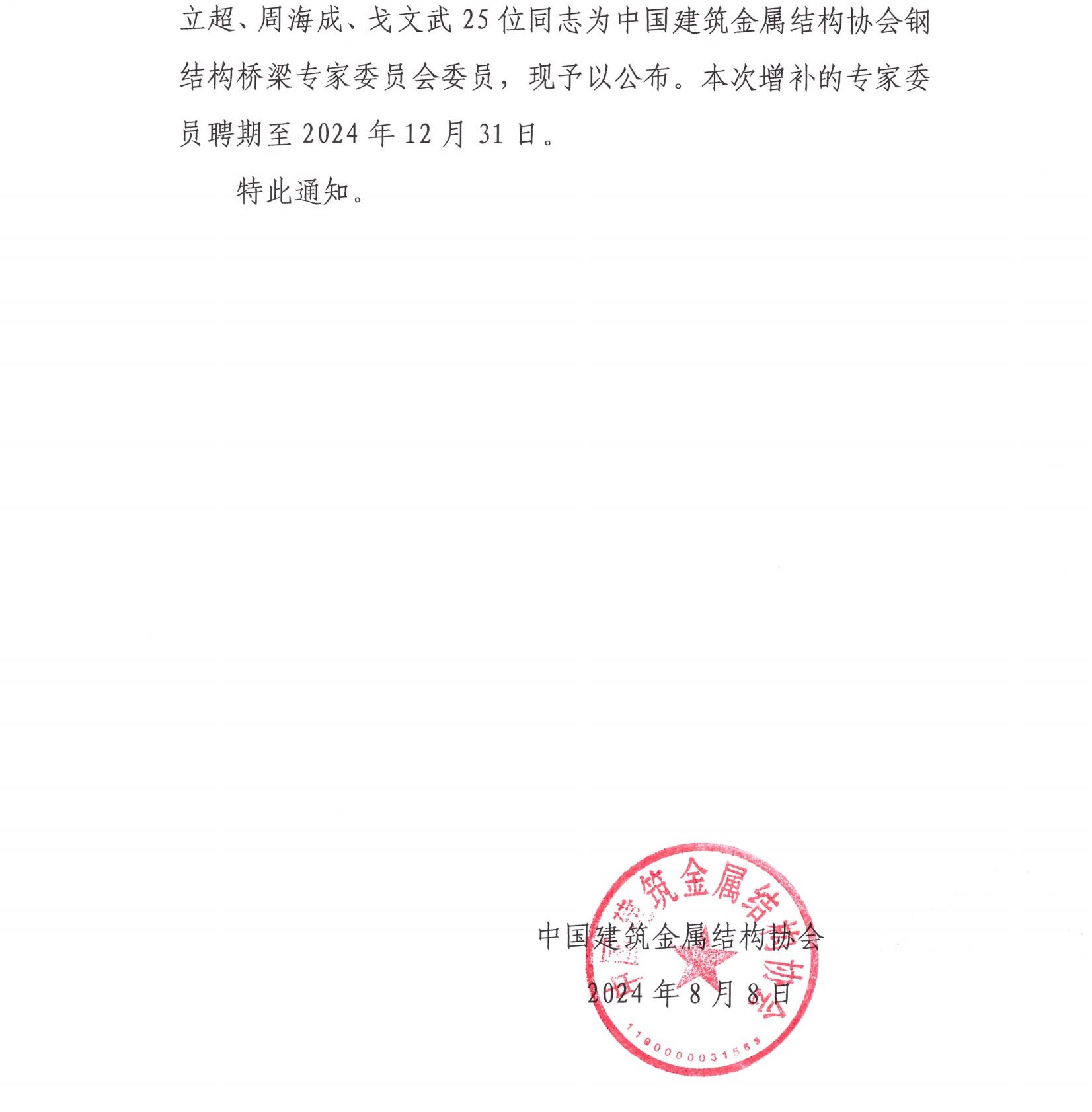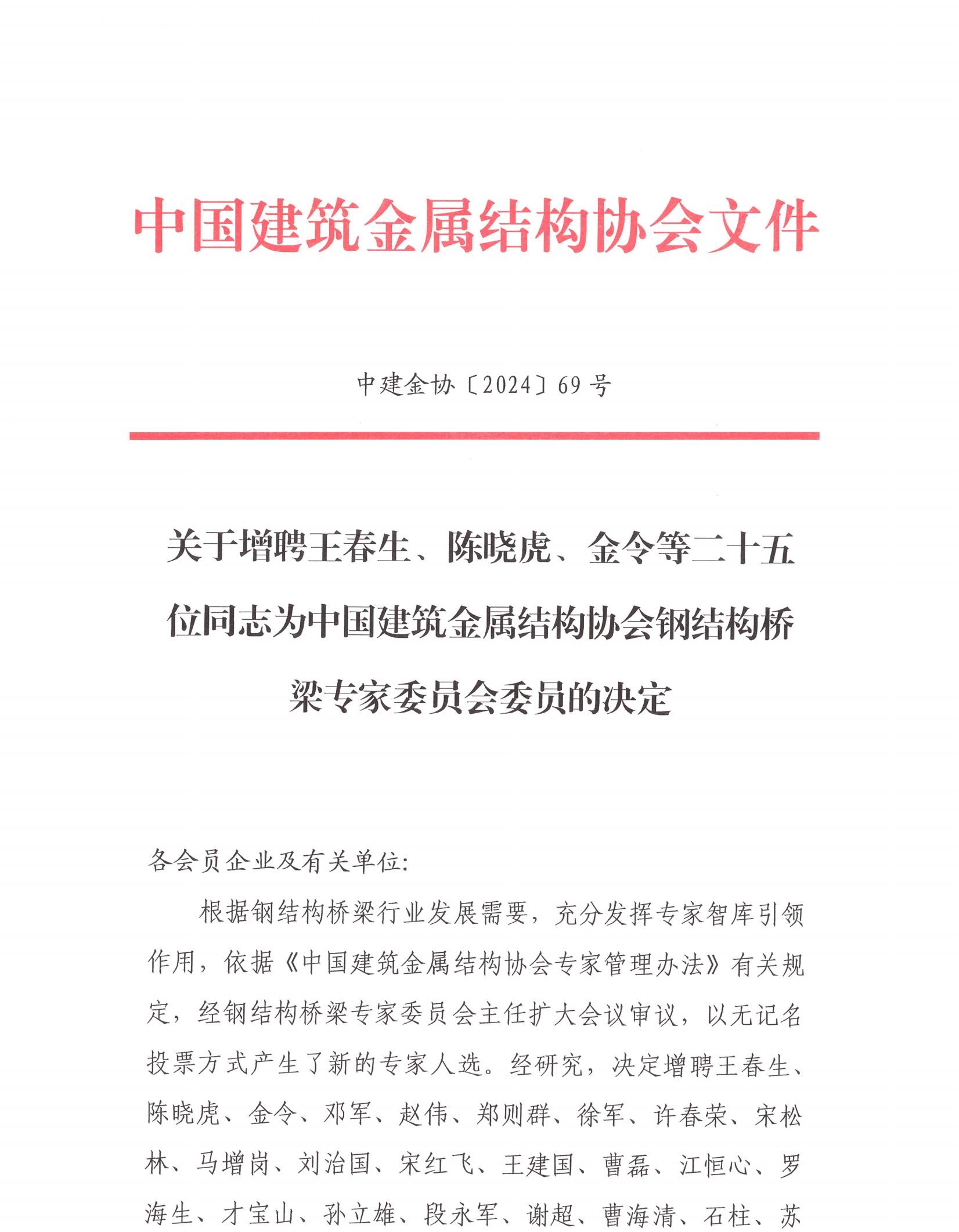 关于增聘王春生、陈晓虎、金令等二十五位同志为中国建筑金属结构协会钢结构桥梁专家委