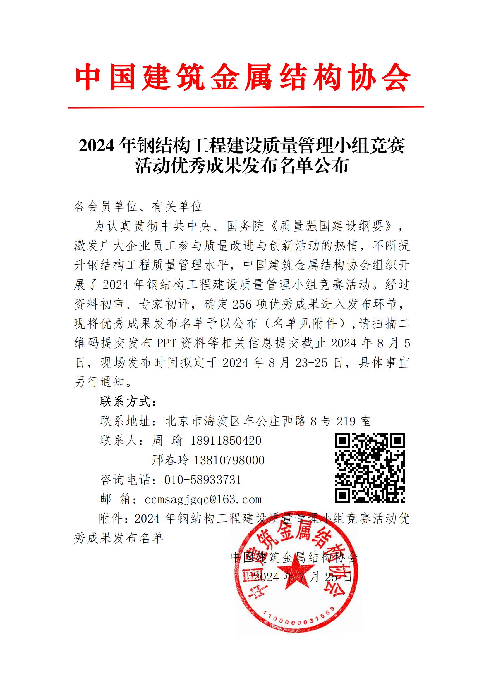 2024年钢结构工程建设质量管理小组竞赛活动优秀成果发布名单公布(内附名单)