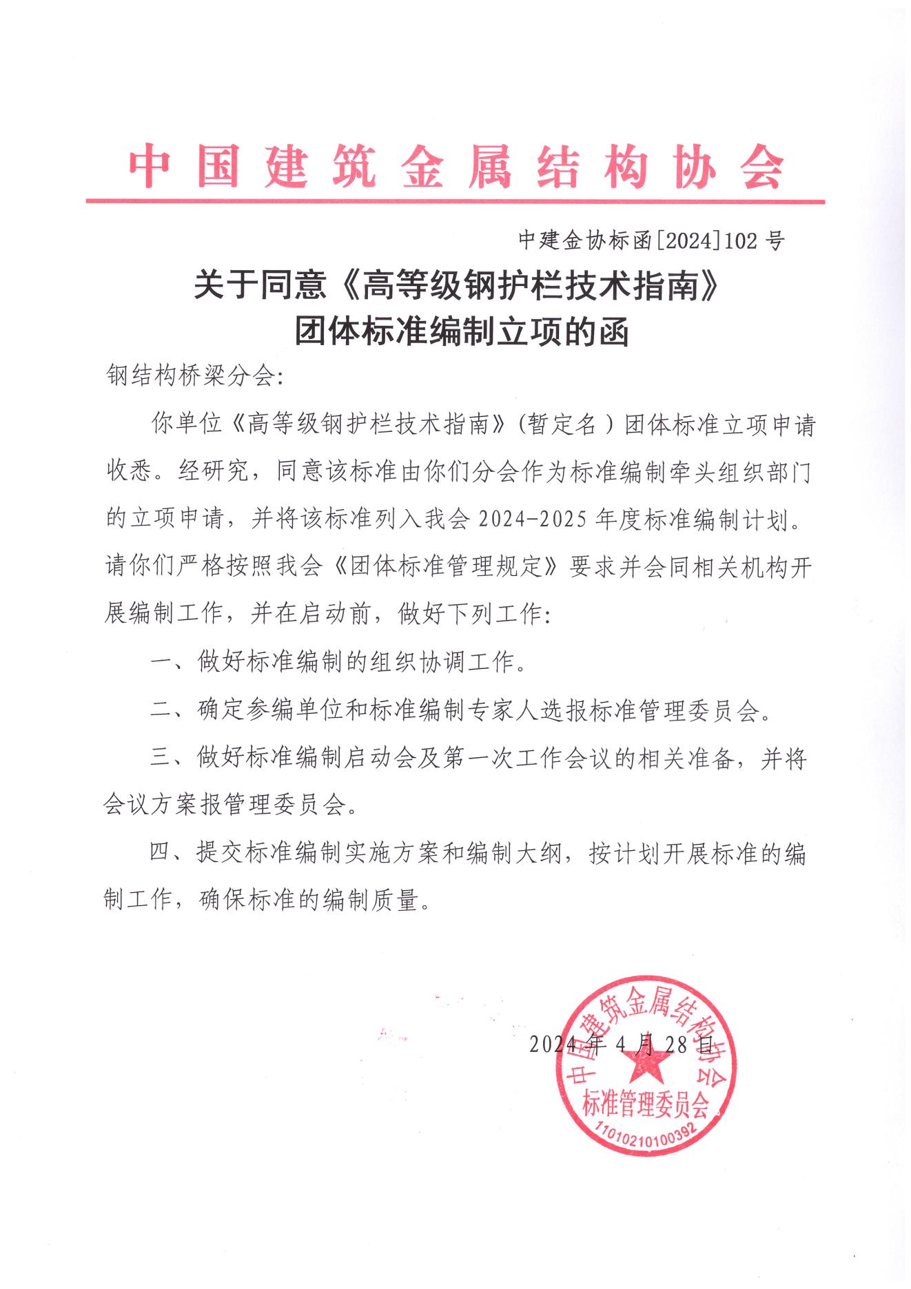关于同意《高等级钢护栏技术指南》团体标准编制立项的函