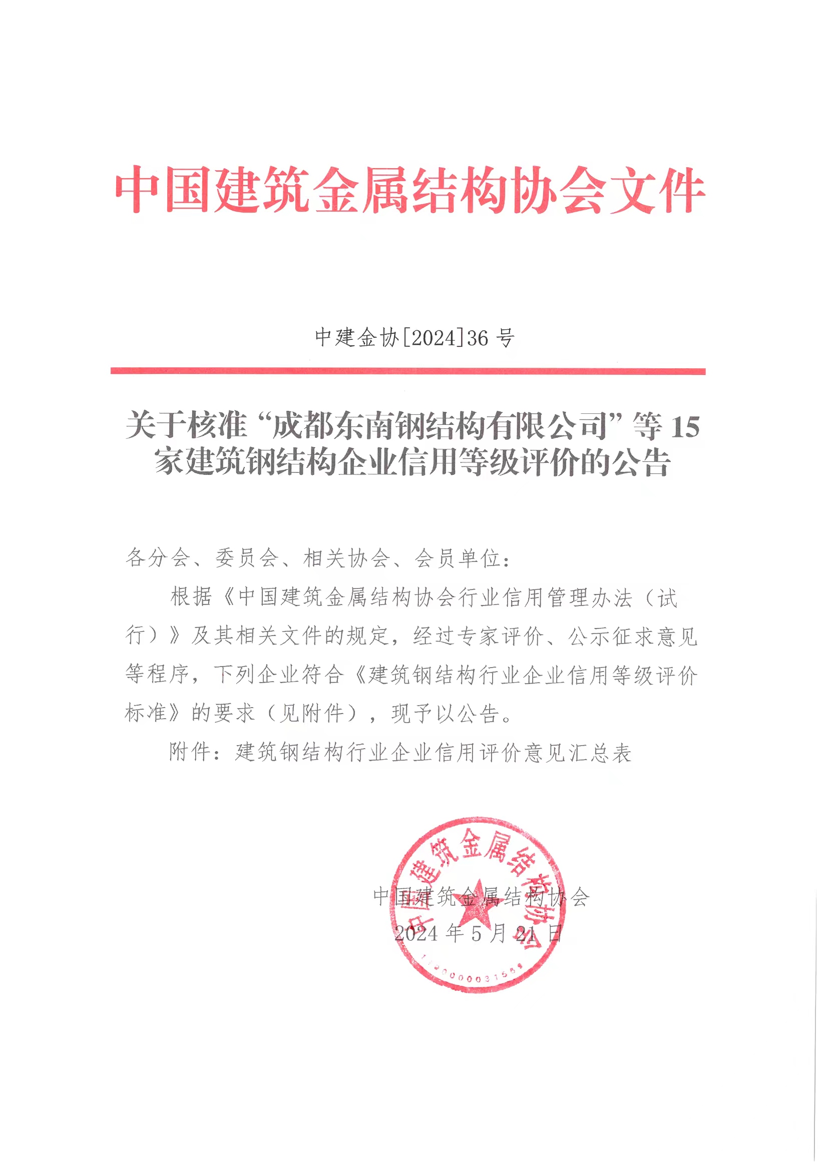 关于核准“成都东南钢结构有限公司”等15家建筑钢结构企业信用等级评价的公告