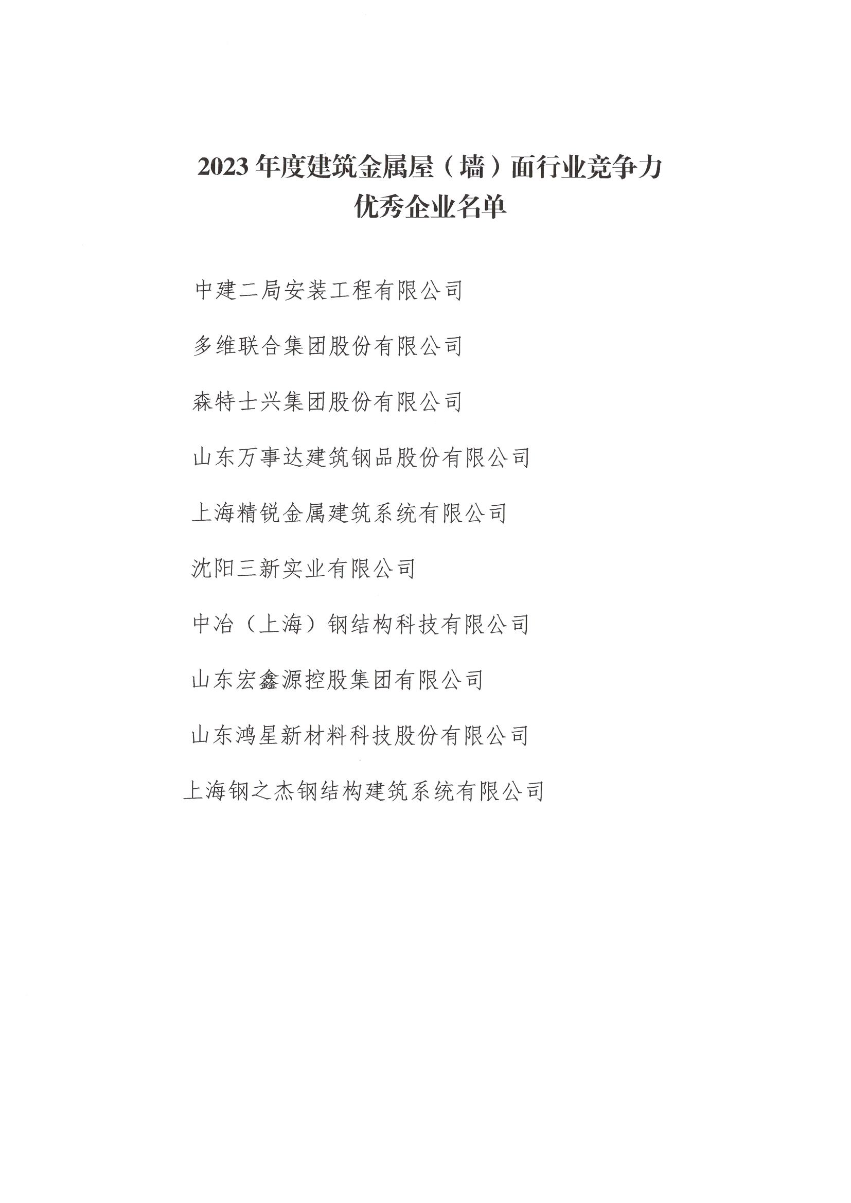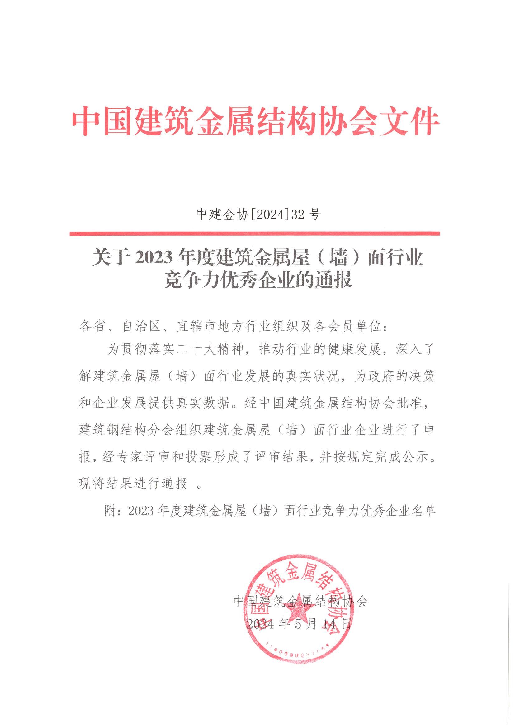 关于 2023年度建筑金属屋(墙)面行业竞争力优秀企业的通报