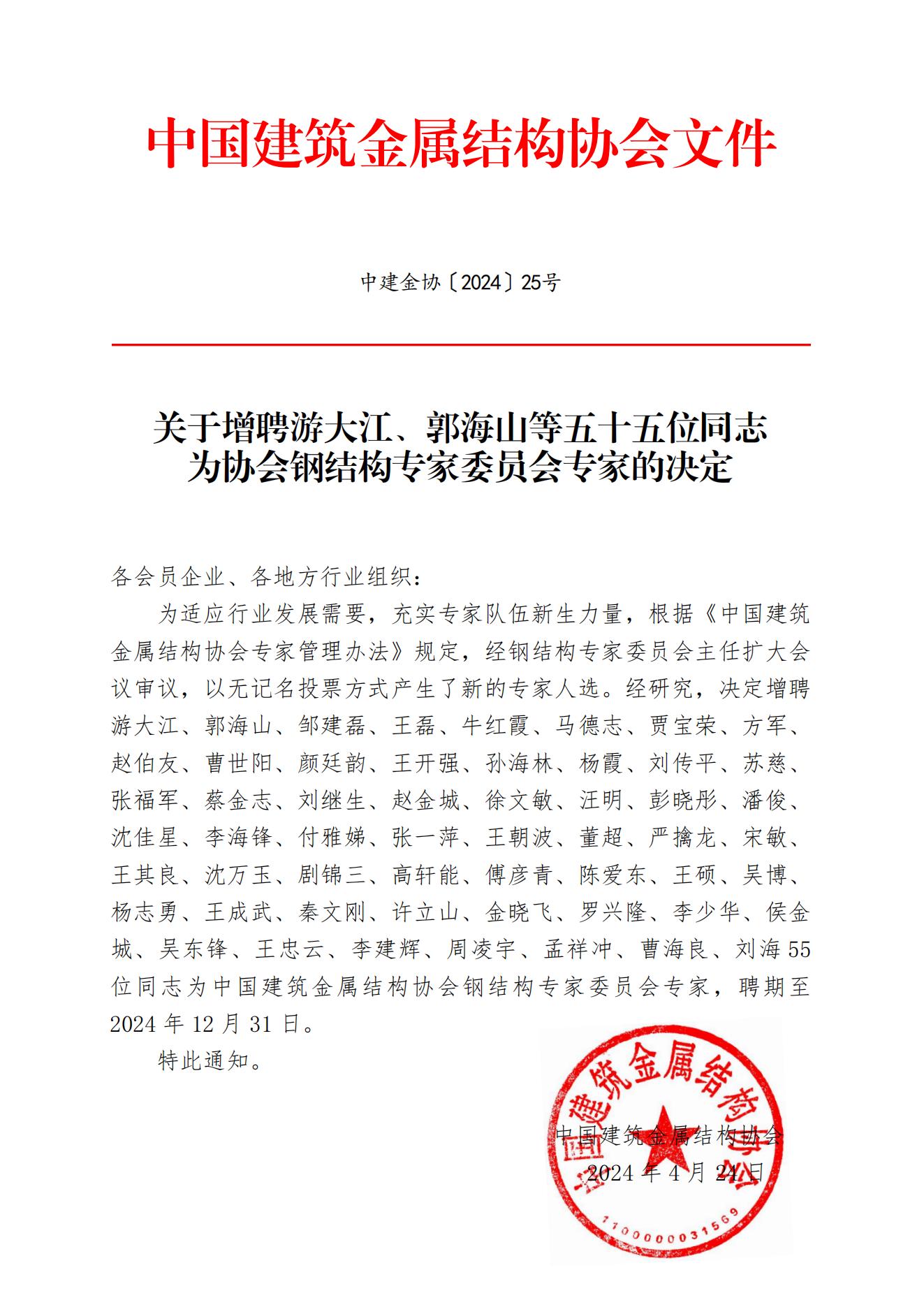 关于增聘游大江、郭海山等五十五位同志为中国建筑金属结构协会钢结构专家委员会专家的
