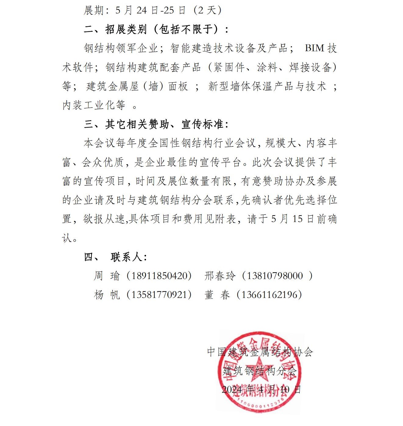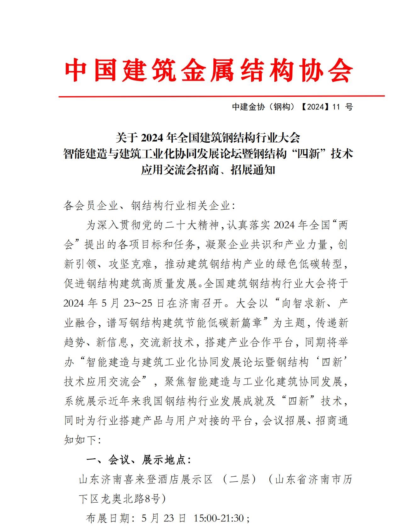 关于2024年全国建筑钢结构行业大会智能建造与建筑工业化协同发展论坛暨“四新”技术应用交流会招商、招展通知