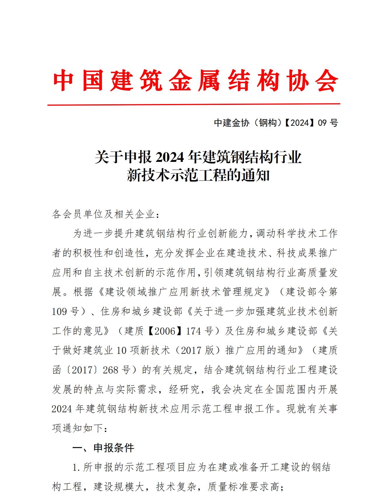 关于申报2024年建筑钢结构行业新技术示范工程的通知