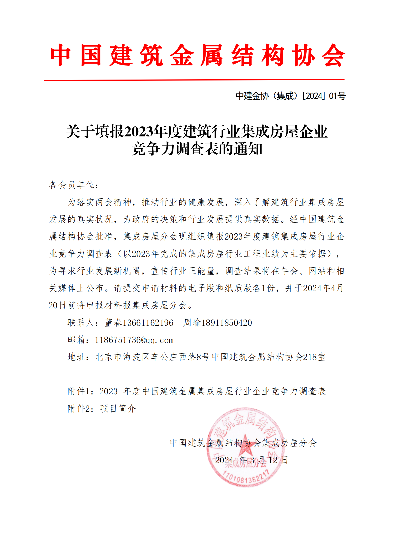 关于填报2023年度建筑集成房屋行业企业竞争力调查表的通知