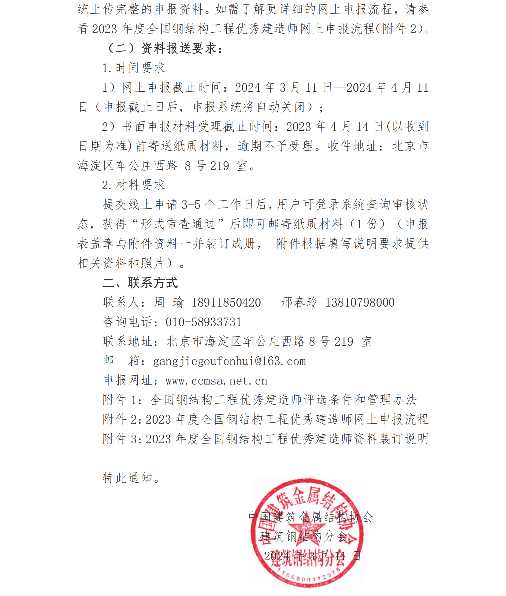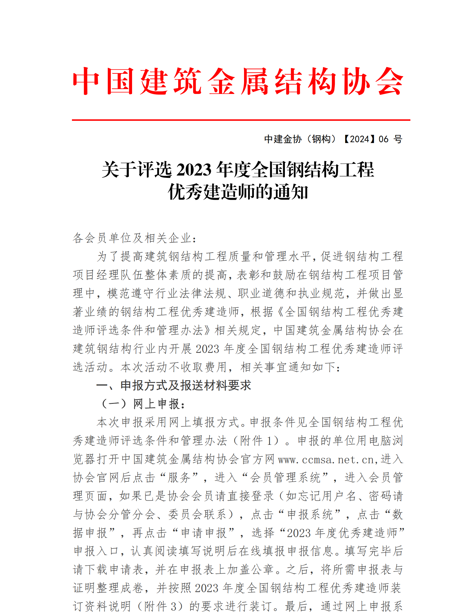 关于评选2023年度全国钢结构工程优秀建造师的通知