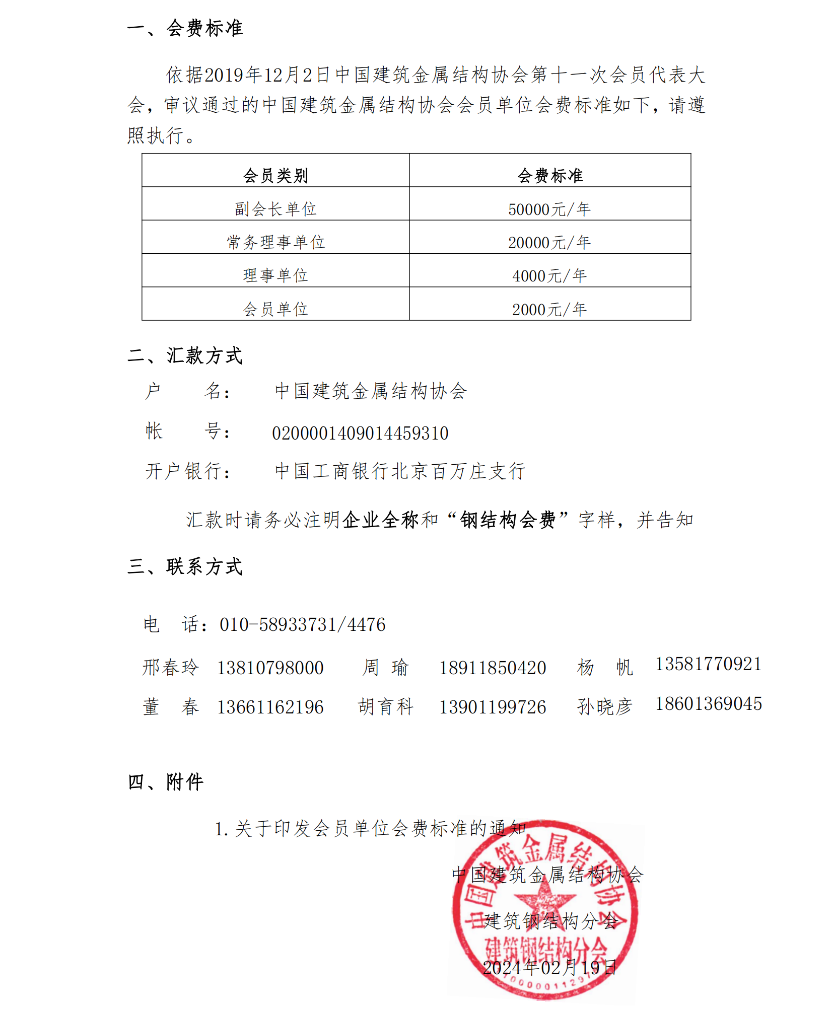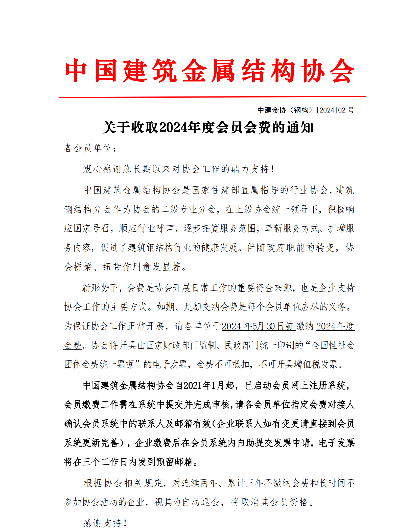 关于收取2024年度中国建筑金属结构协会会员会费的通知