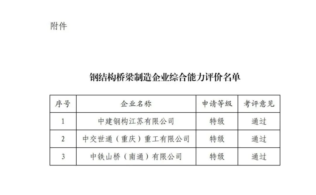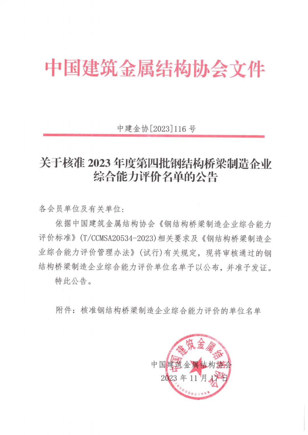 关于核准2023年度第四批钢结构桥梁制造企业综合能力评价名单的公告
