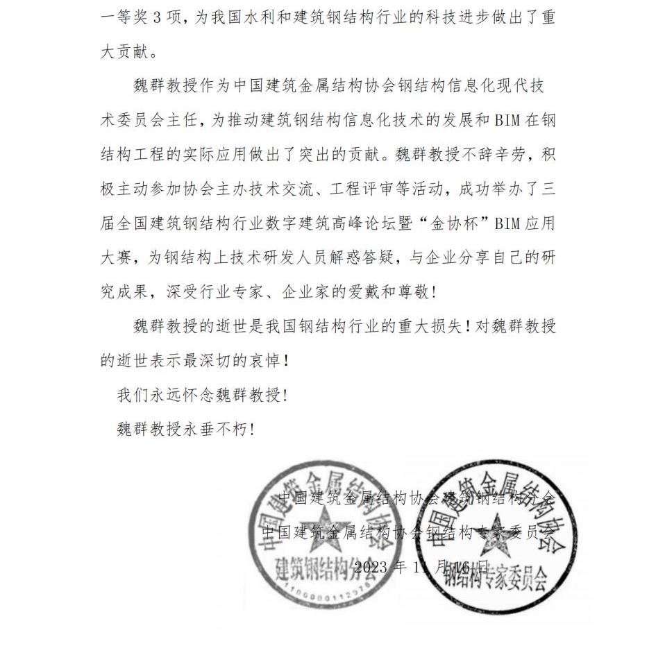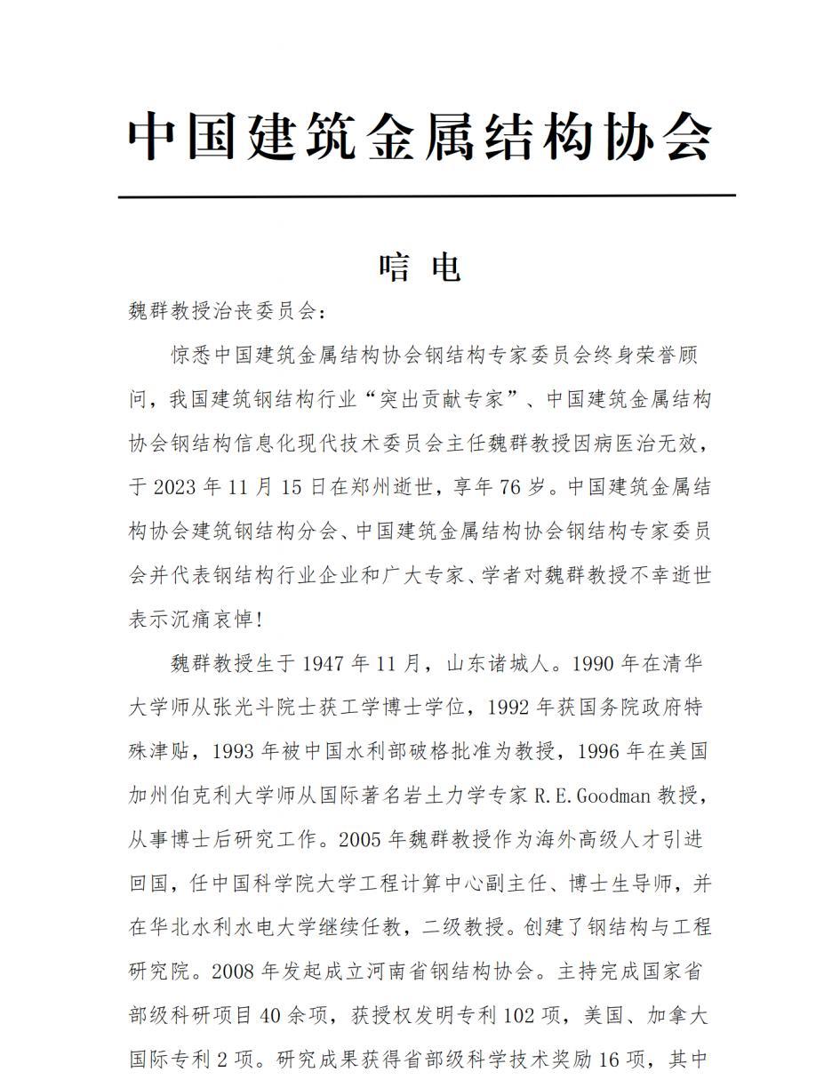 唁电-深痛悼念钢结构专家委员会终身荣誉顾问魏群教授