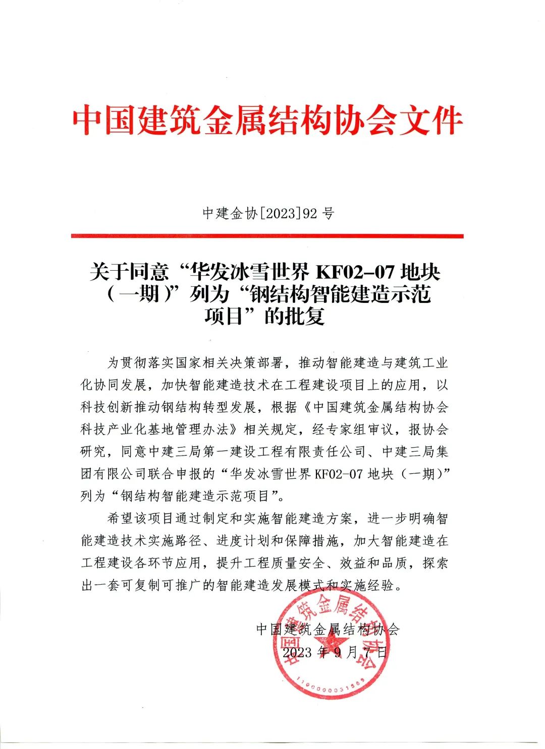 关于同意华发冰雪世界KF02-07地块(一期)列为“钢结构智能建造示范项目”的批复