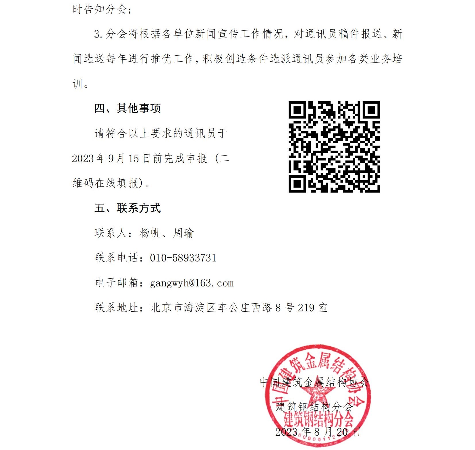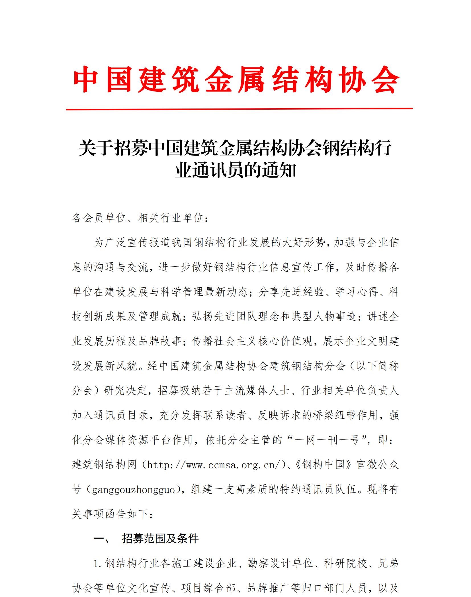 关于招募中国建筑金属结构协会钢结构行业通讯员的通知