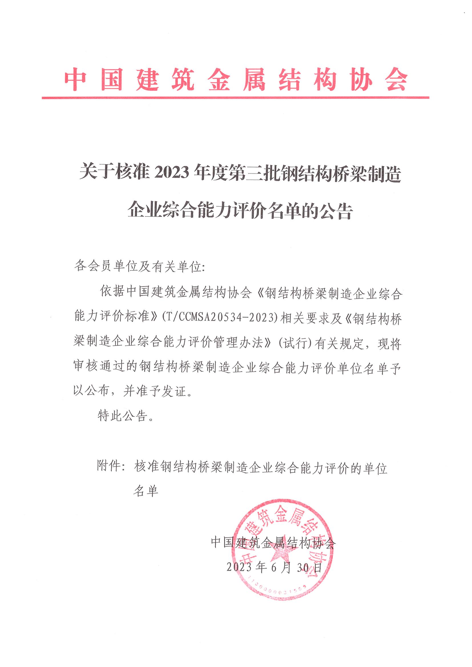 关于核准2023年度第三批钢结构桥梁制造企业综合能力评价名单的公告