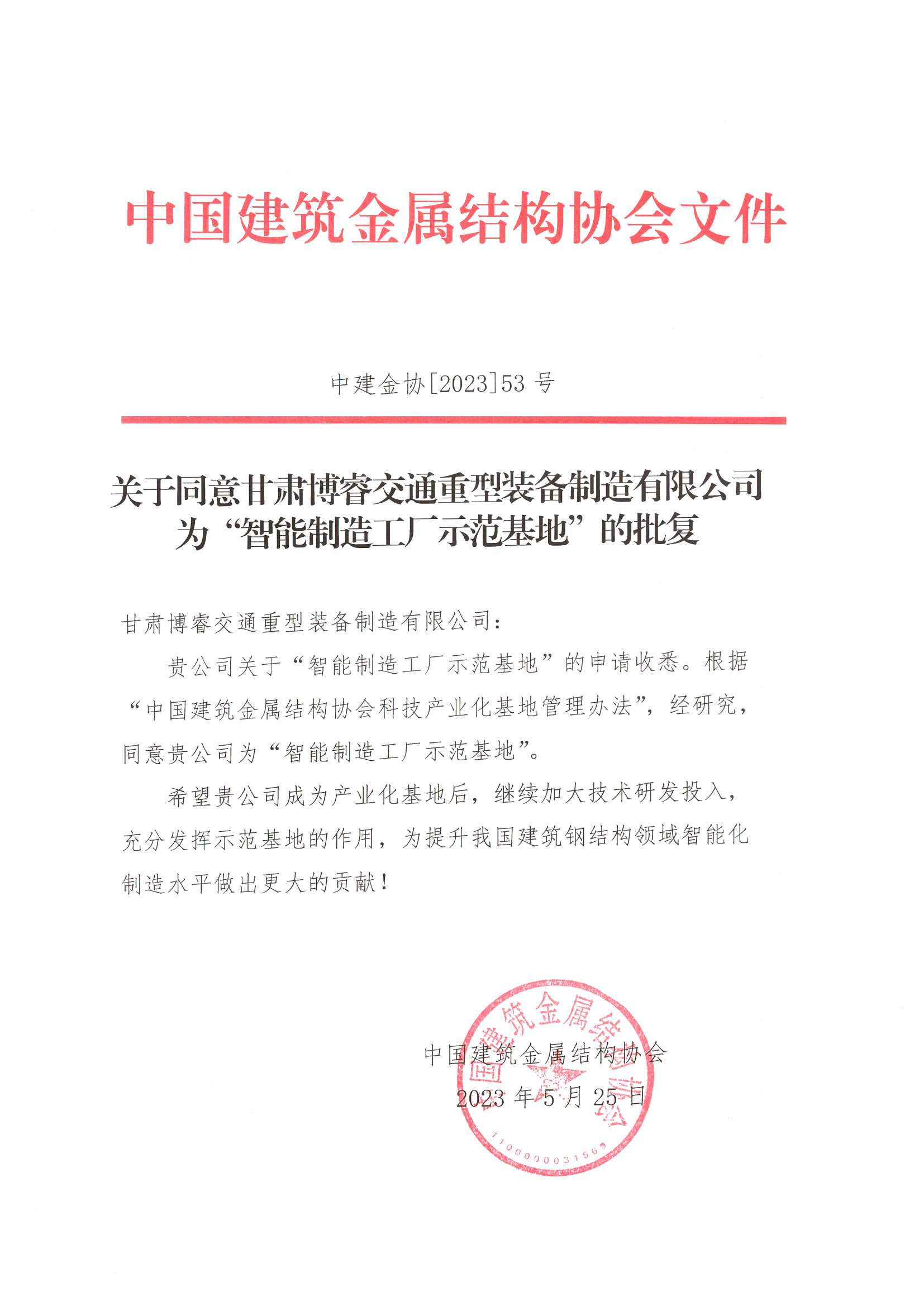 关于同意甘肃博睿交通重型装备制造有限公司为“智能制造工厂示范基地”的批复