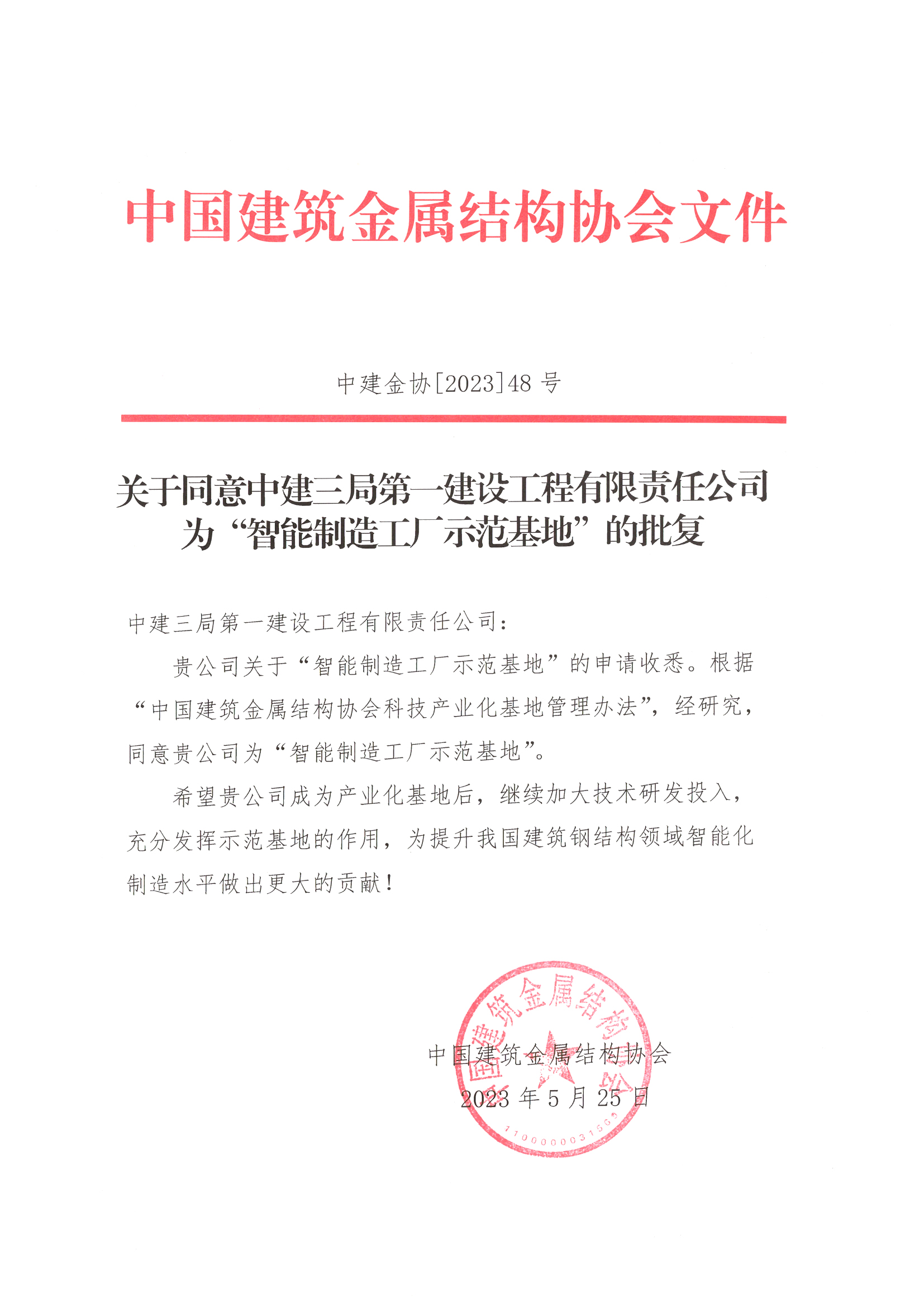关于同意中建三局第一建设工程有限责任公司为“智能制造工厂示范基地”的批复