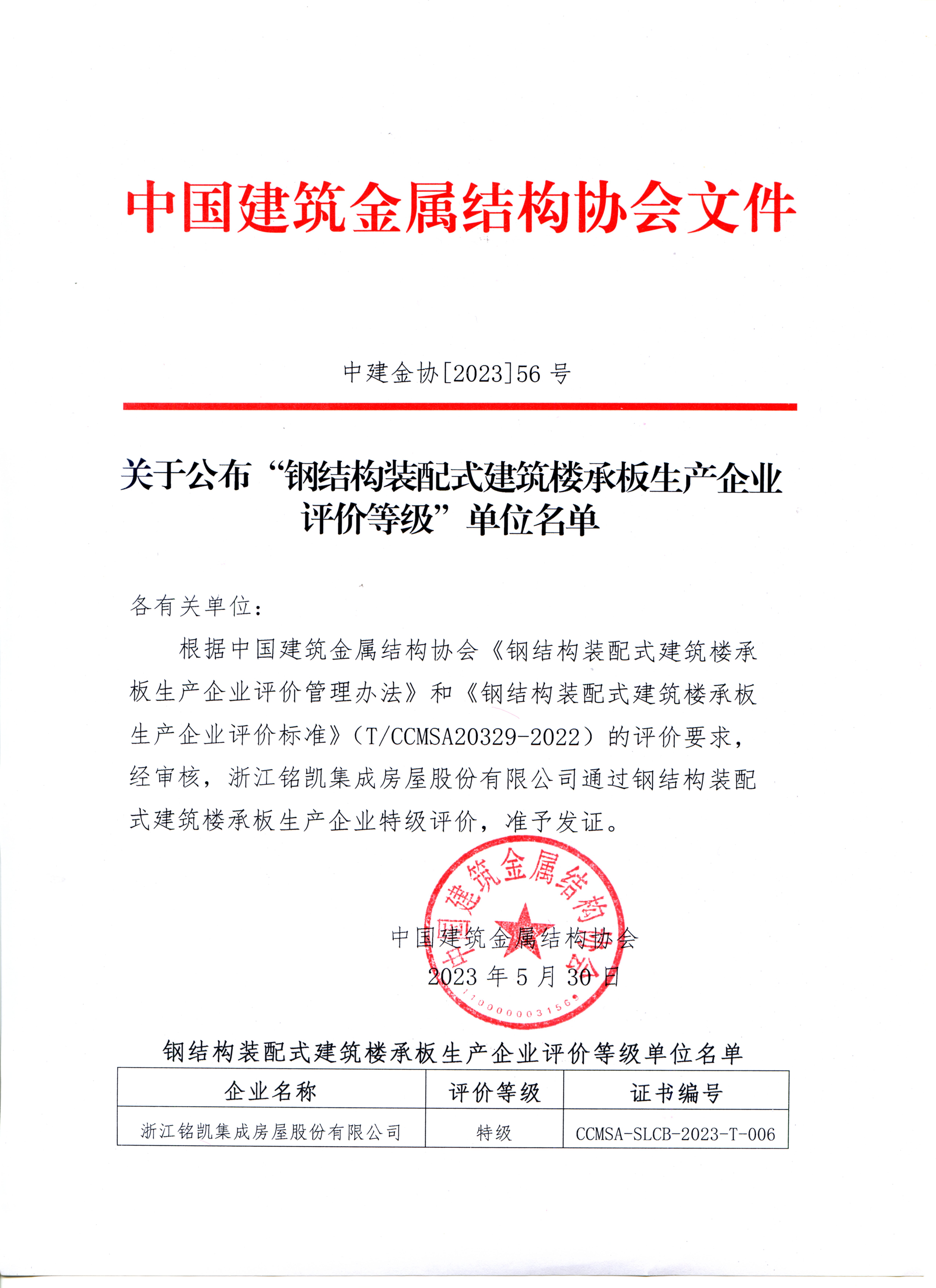 关于公布钢结构装配式建筑楼承板生产企业评价等级单位名单