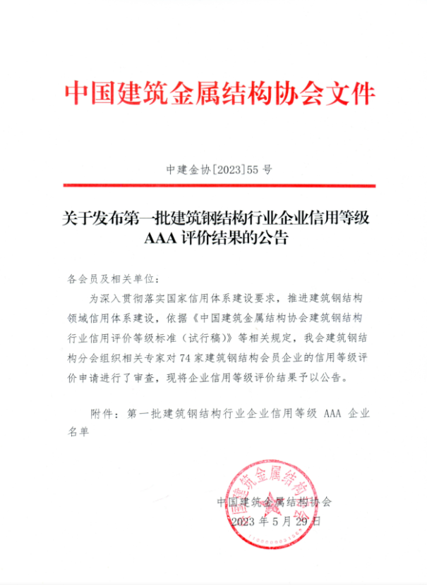 关于发布第一批建筑钢结构行业企业信用等级AAA评价结果的公告