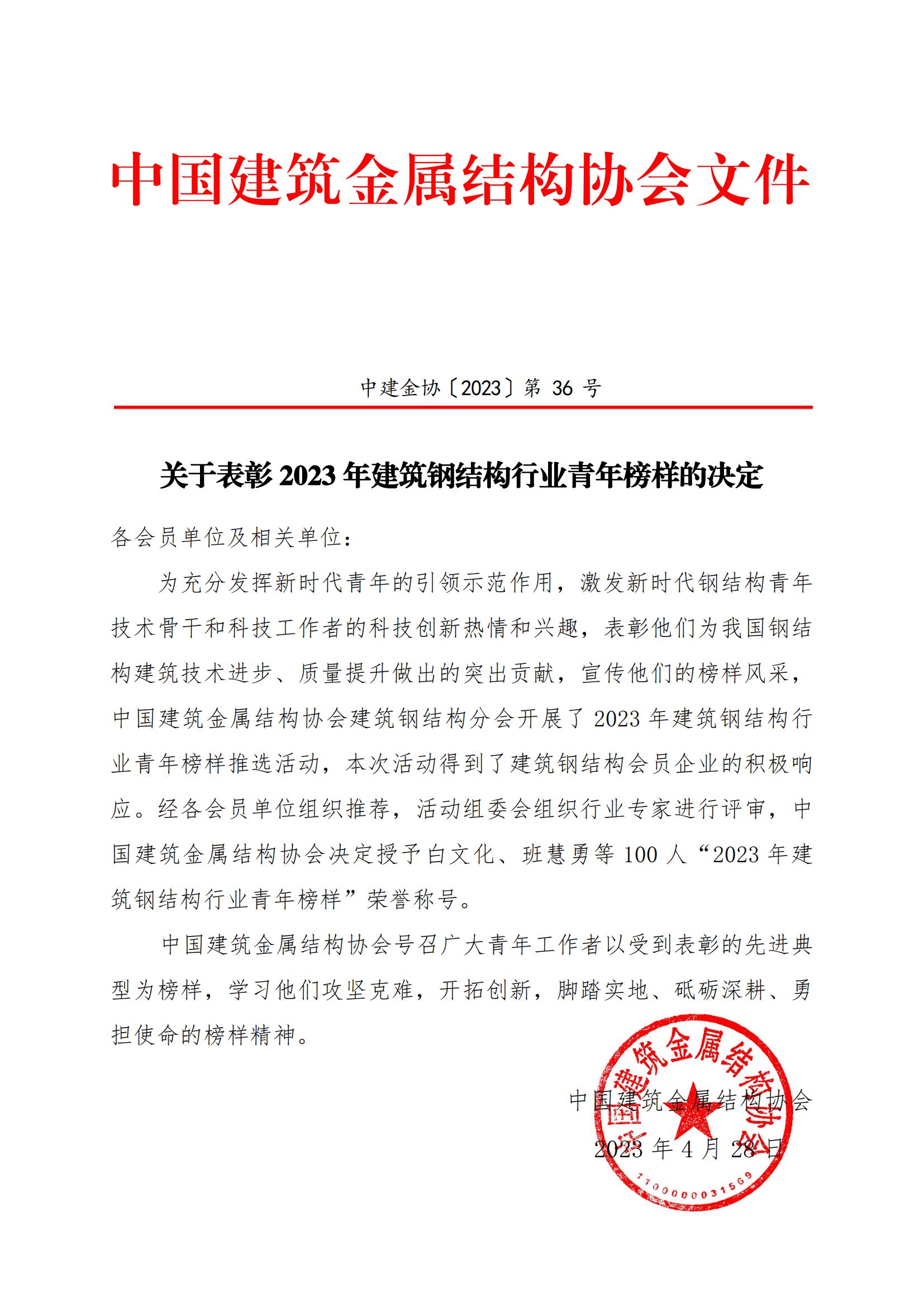 关于表彰2023年建筑钢结构行业青年榜样的决定