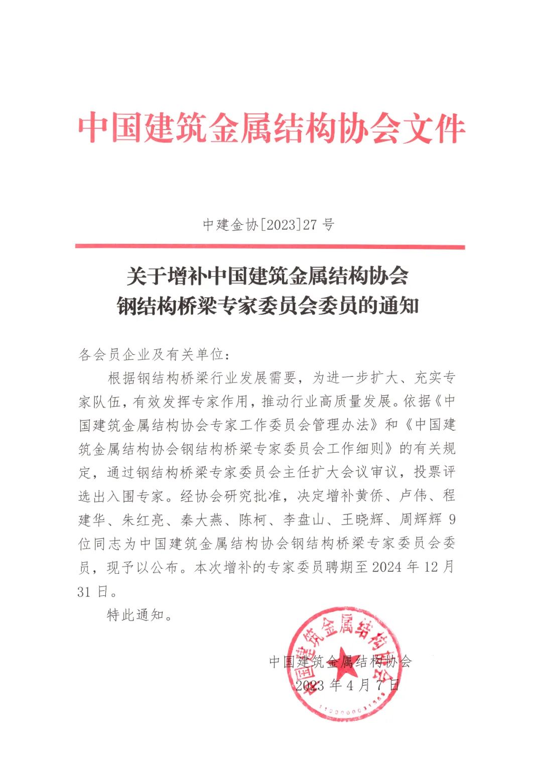 关于增补中国建筑金属结构协会钢结构桥梁专家委员会委员的通知
