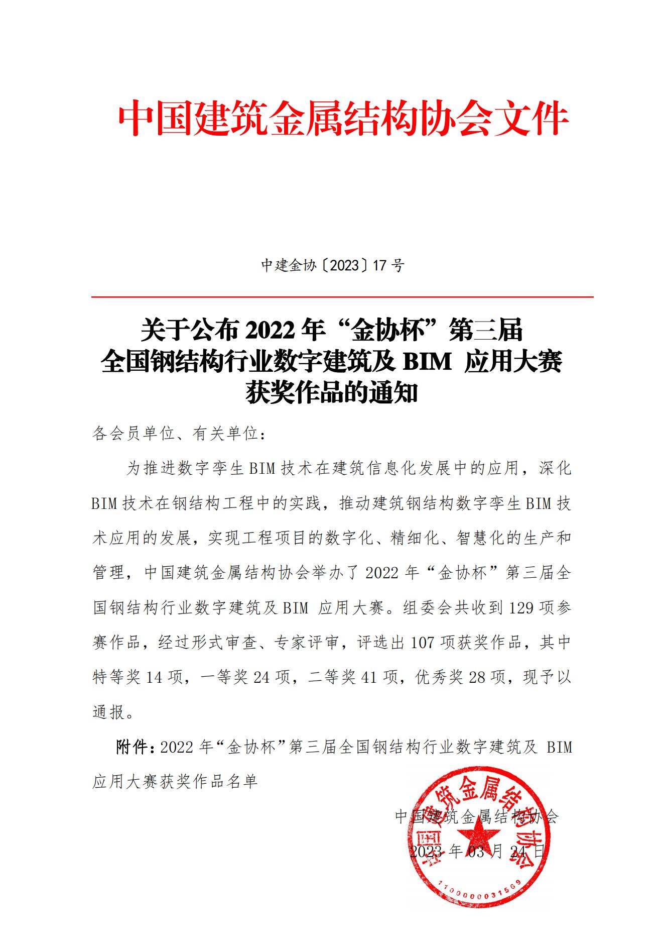 关于公布 2022 年“金协杯”第三届 全国钢结构行业数字建筑及BIM 应用大赛 获奖作品的通知