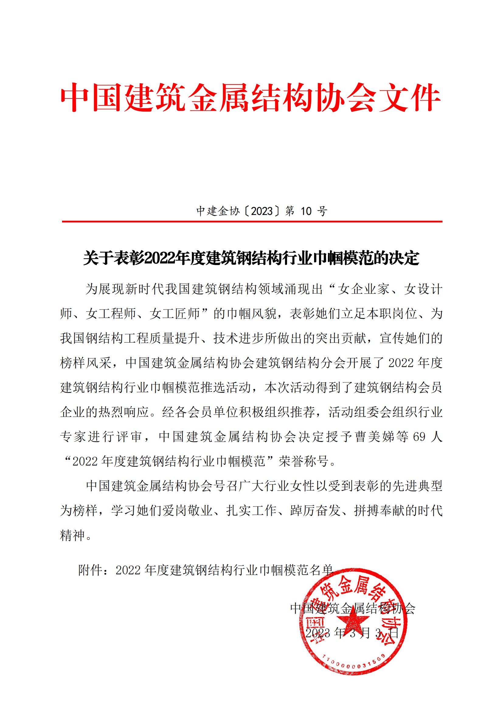 关于表彰2022年度建筑钢结构行业巾帼模范的决定