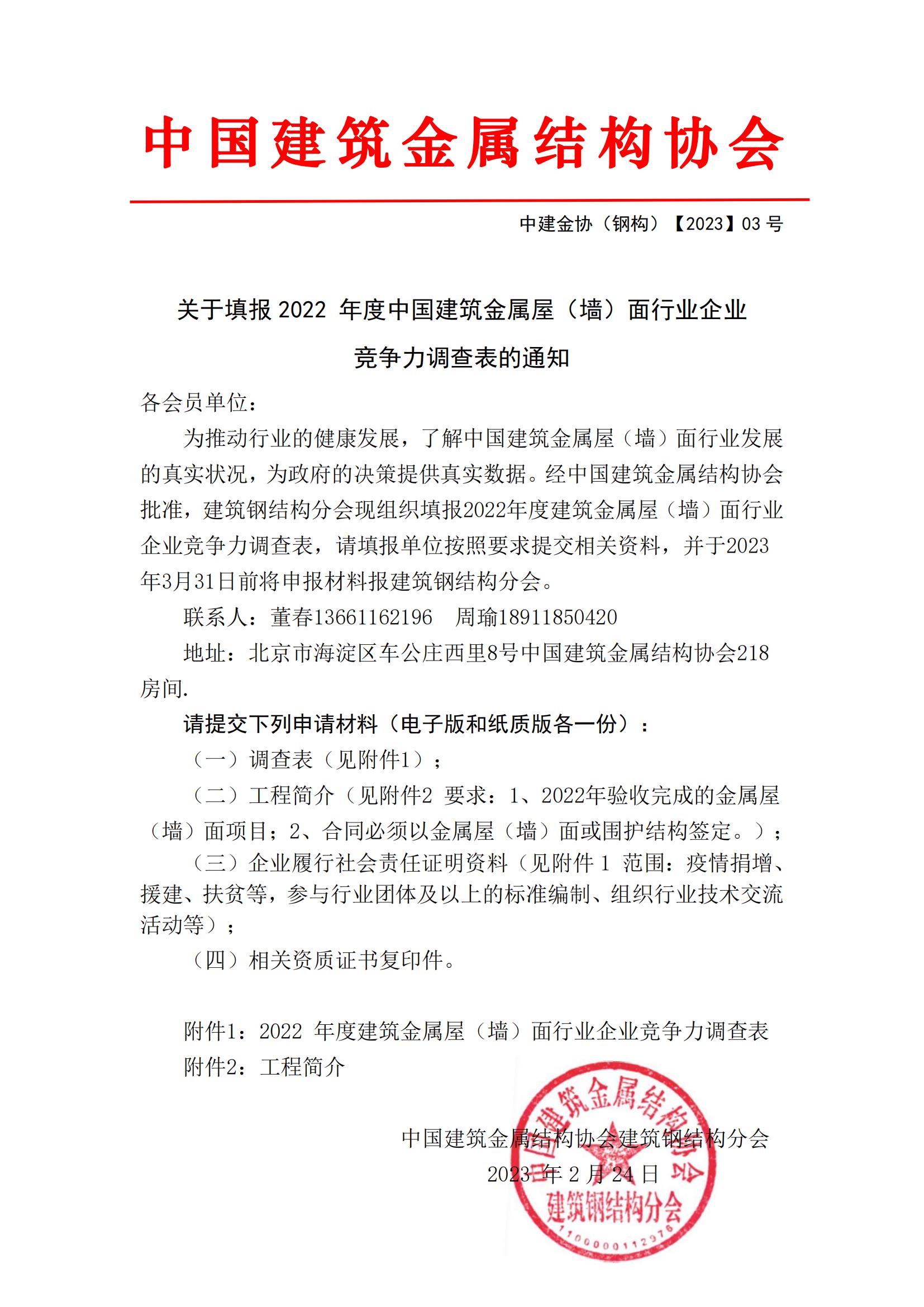 关于填报2022年度建筑金属屋(墙)面行业企业竞争力调查表的通知