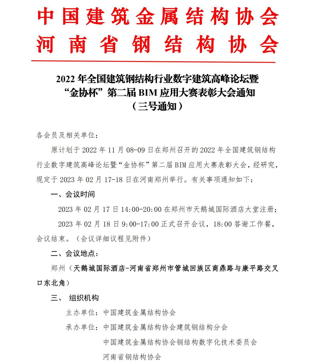 2022年“金协杯”第二届全国钢结构行业数字建筑论坛暨BIM应用大赛表彰会议通知(三号通