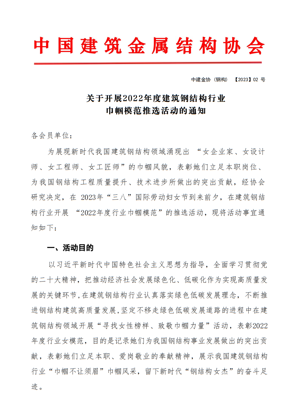 关于开展2022年度建筑钢结构行业巾帼模范推选活动的通知
