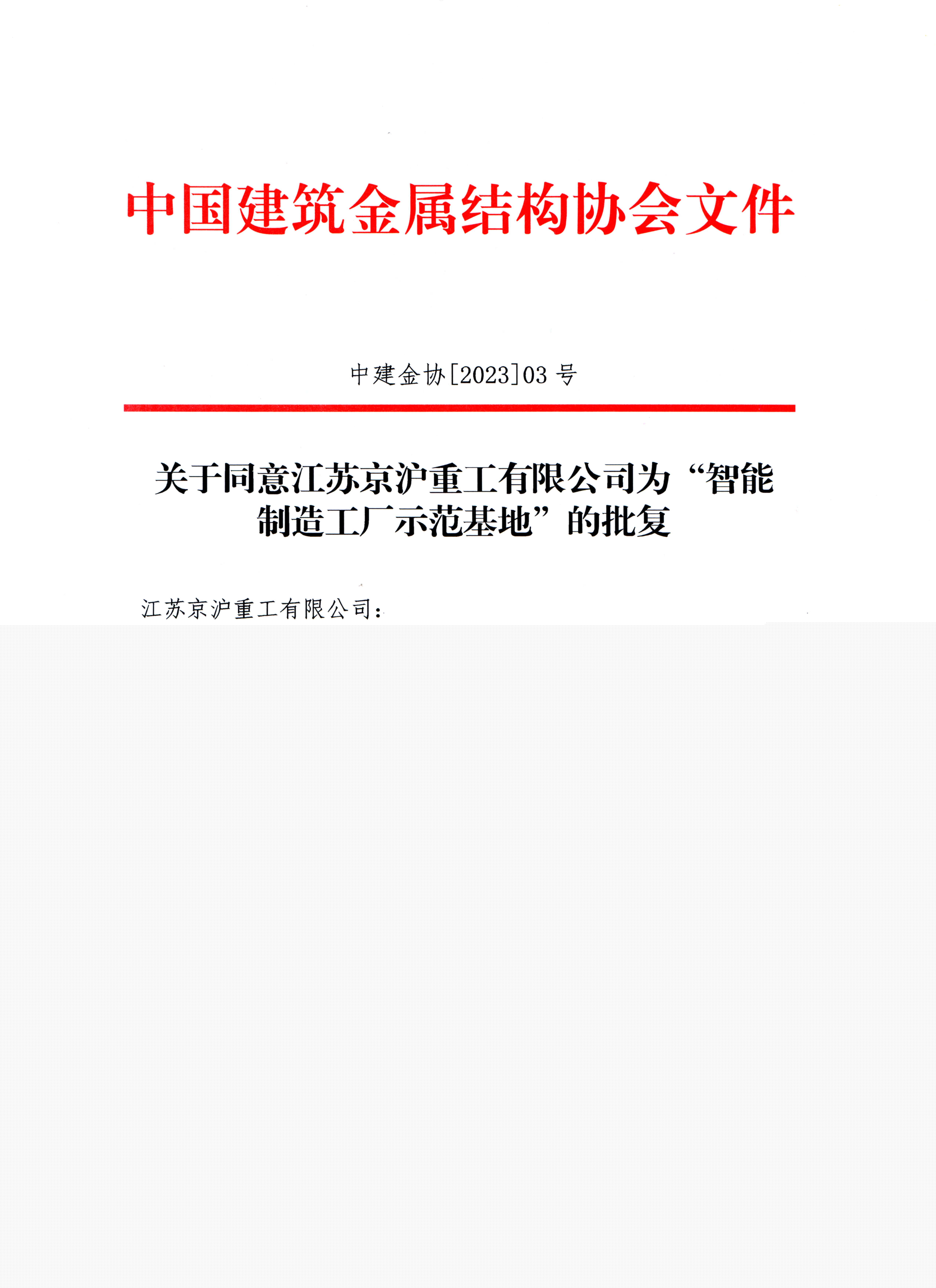 关于同意江苏京沪重工有限公司为“智能制造工厂示范基地”的批复