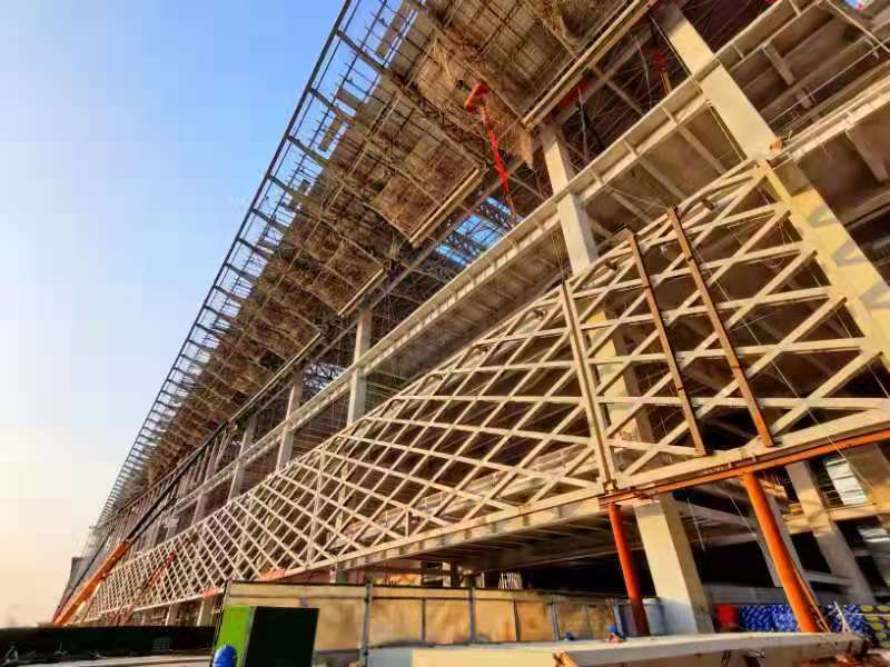 据介绍,国家会议中心二期工程位于北京奥林匹克中心区,建设用地面积9.3万平方米,总建筑面积约41万平方米,是目前北京市在建的最大单体建筑。其主体工程以钢结构为主,总用钢量达到12.6万吨。国家会议中心二期工程钢结构的建筑顶层是一个总投影面积达2.6万平方米的钢屋盖,约4个足球场那么大,全部由钢网壳结构和桁架结构组成。整个钢网壳结构由85榀这样的钢拱梁组成,每榀钢拱梁的东西跨度为72米,宽度为3米。项目采用“高空滑移技法施工入位”的方式,通过建筑工程信息系统BIM技术,实现钢网壳“地面小拼、操作架中拼”的操作步骤。在建筑现场,通过数字化的液压顶推系统,将每片钢网壳以每小时4米左右的速度,按照由远及近、双向并进的原则在52米空中依次安装到位,犹如空中拼积木一样“拼出”一个巨大的钢屋盖。据了解,钢结构屋盖滑移施工可以有效减少高空作业量,提升项目建设速度。针对体量超大、结构形式复杂、工期紧、标准高的钢结构施工,项目团队还运用三维激光扫描、BIM建模等前沿技术,对方案不断进行优化,实现节材近5000吨,极大缩短了工期。