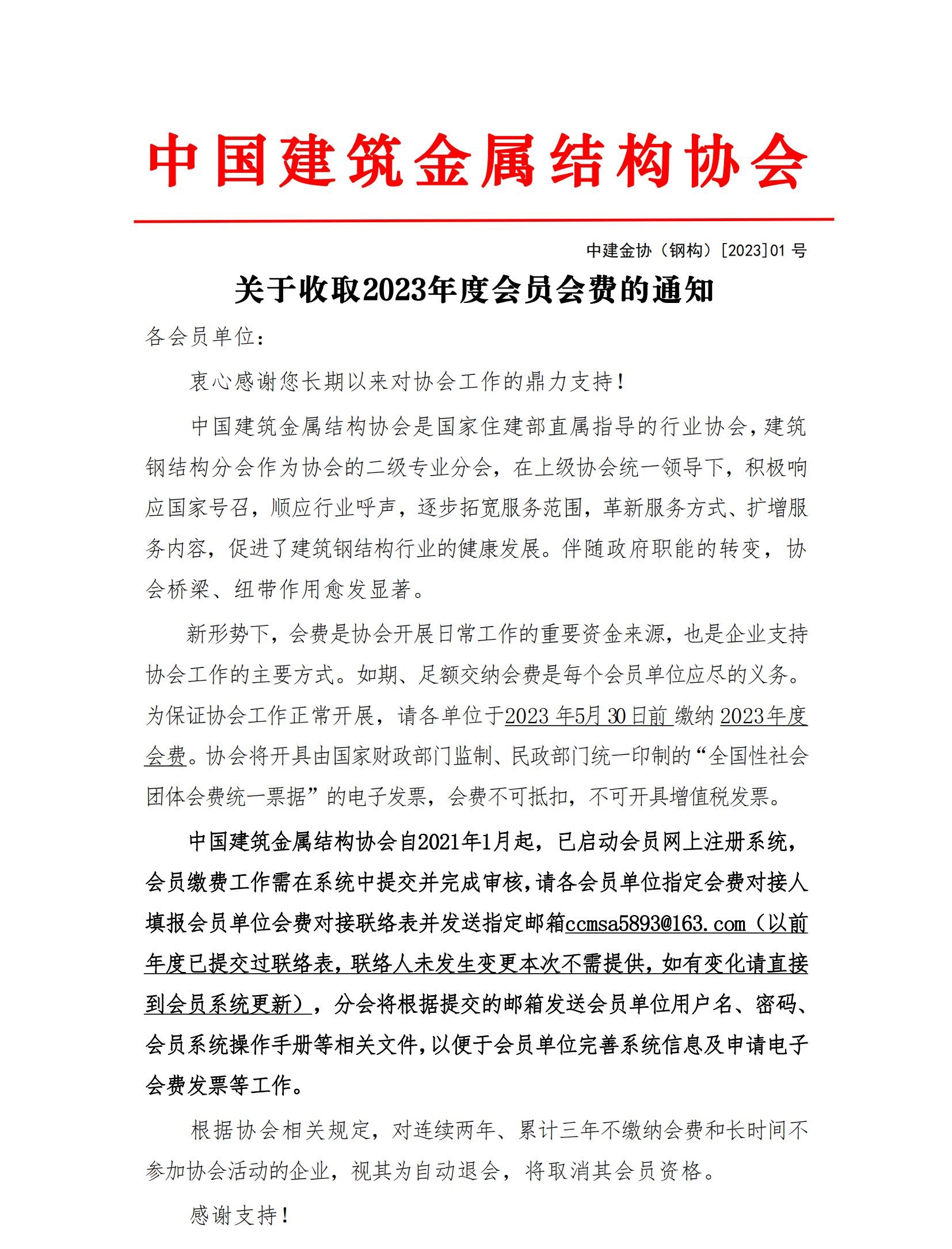 关于收取2023年度中国建筑金属结构协会会员会费的通知