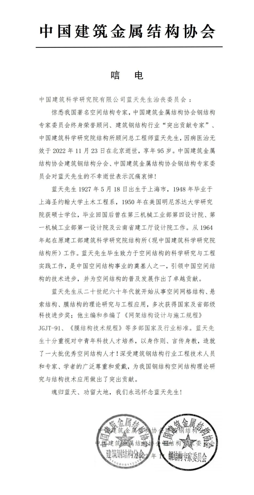 沉痛悼念中国建筑金属结构协会钢结构专家委员会终身荣誉顾问蓝天先生