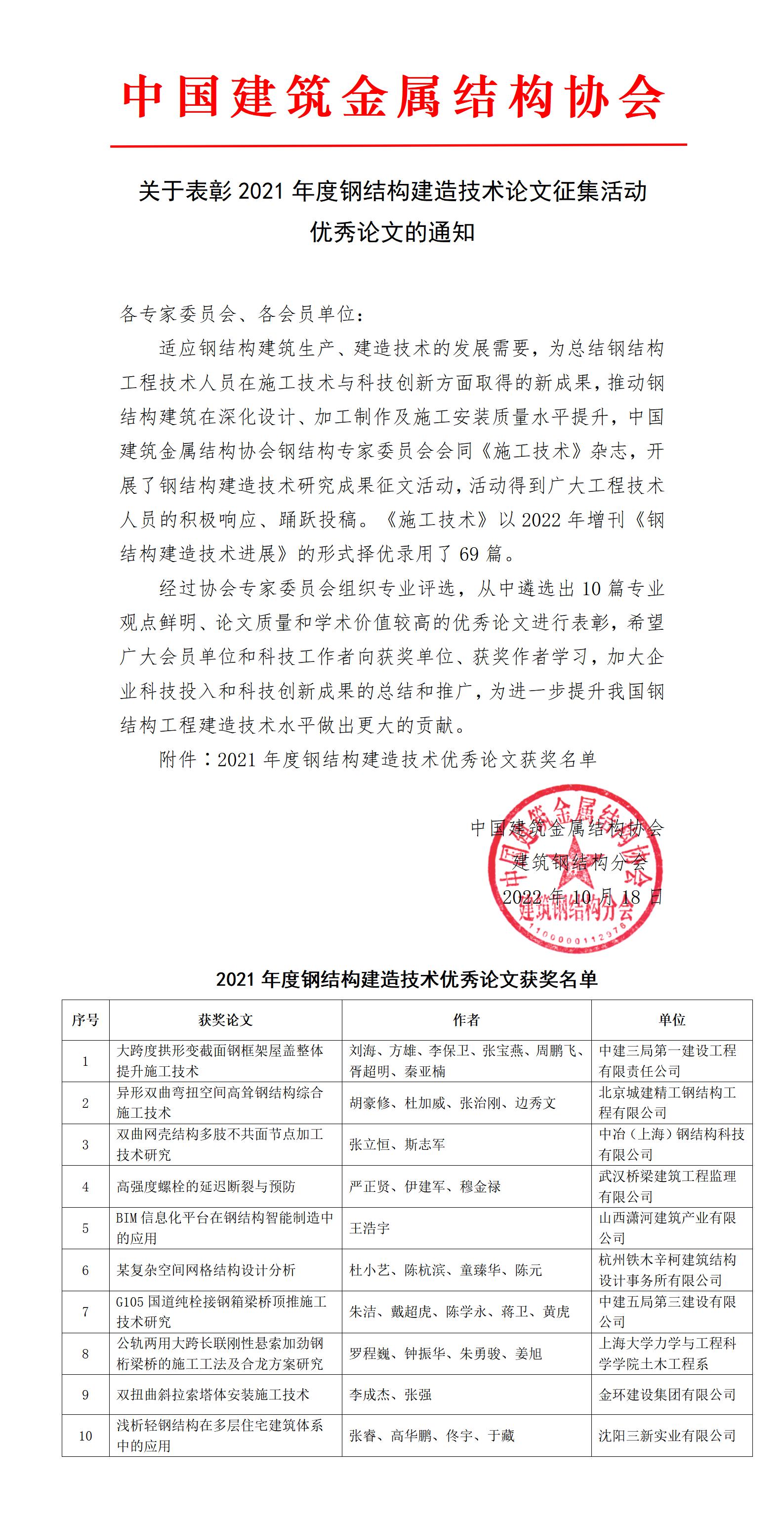 关于表彰2021年度钢结构建造技术论文征集活动优秀论文的通知