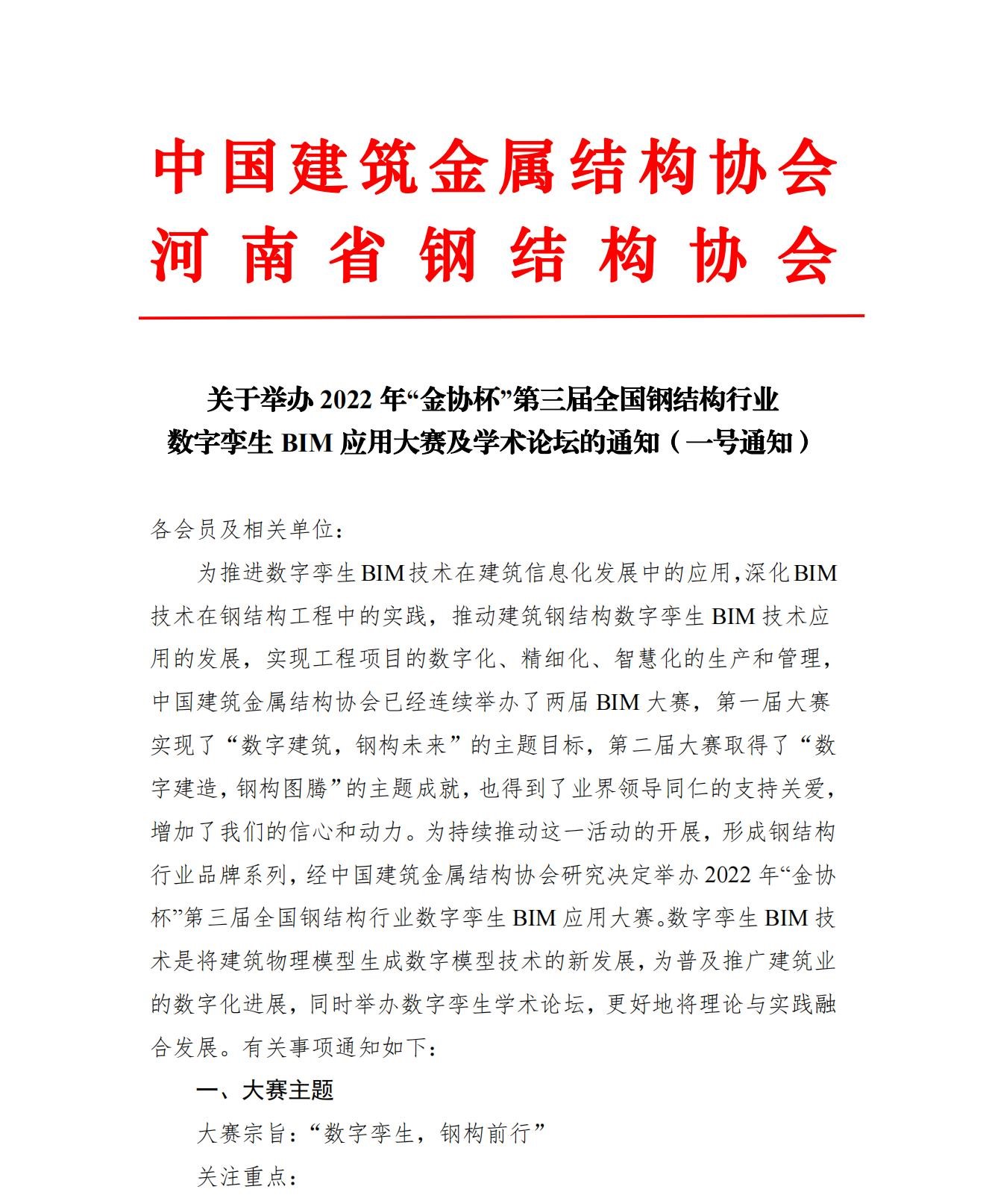关于举办 2022 年“金协杯”第三届全国钢结构行业数字孪生 BIM 应用大赛及学术论坛的通知