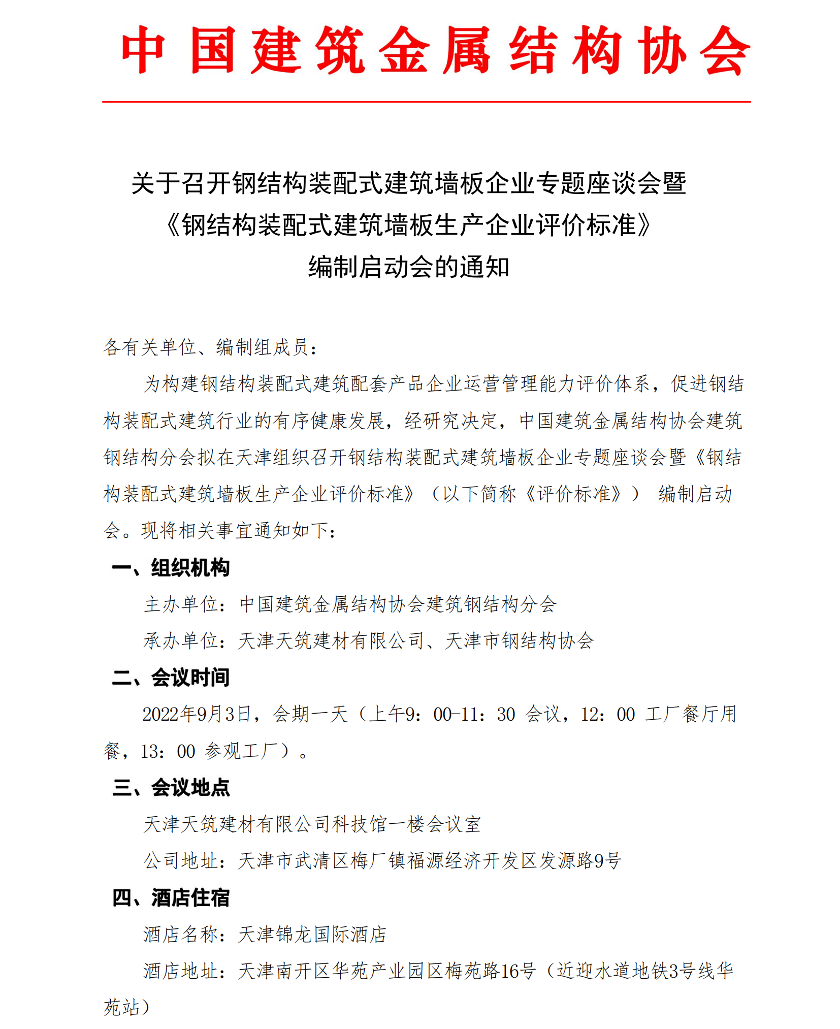 关于召开钢结构装配式建筑墙板企业专题座谈会暨 《钢结构装配式建筑墙板生产企业评价标准》 编制启动会的通知