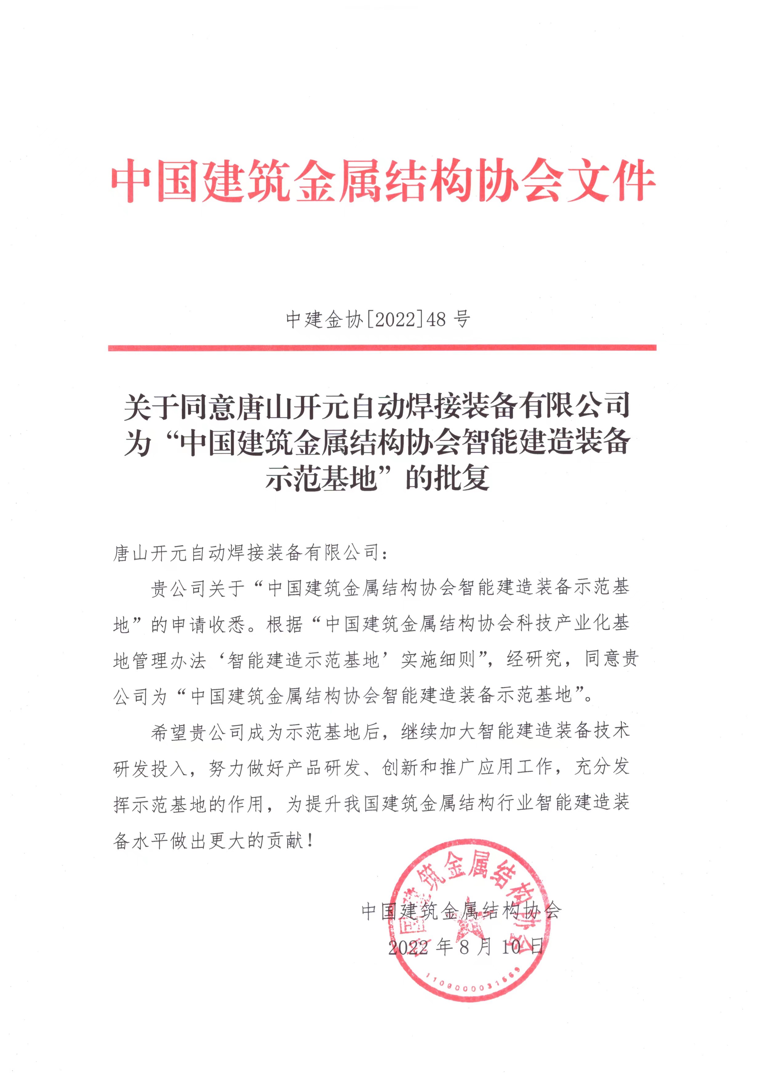 关于同意唐山开元自动焊接装备有限公司为“中国建筑金属结构协会智能建造装备示范基地