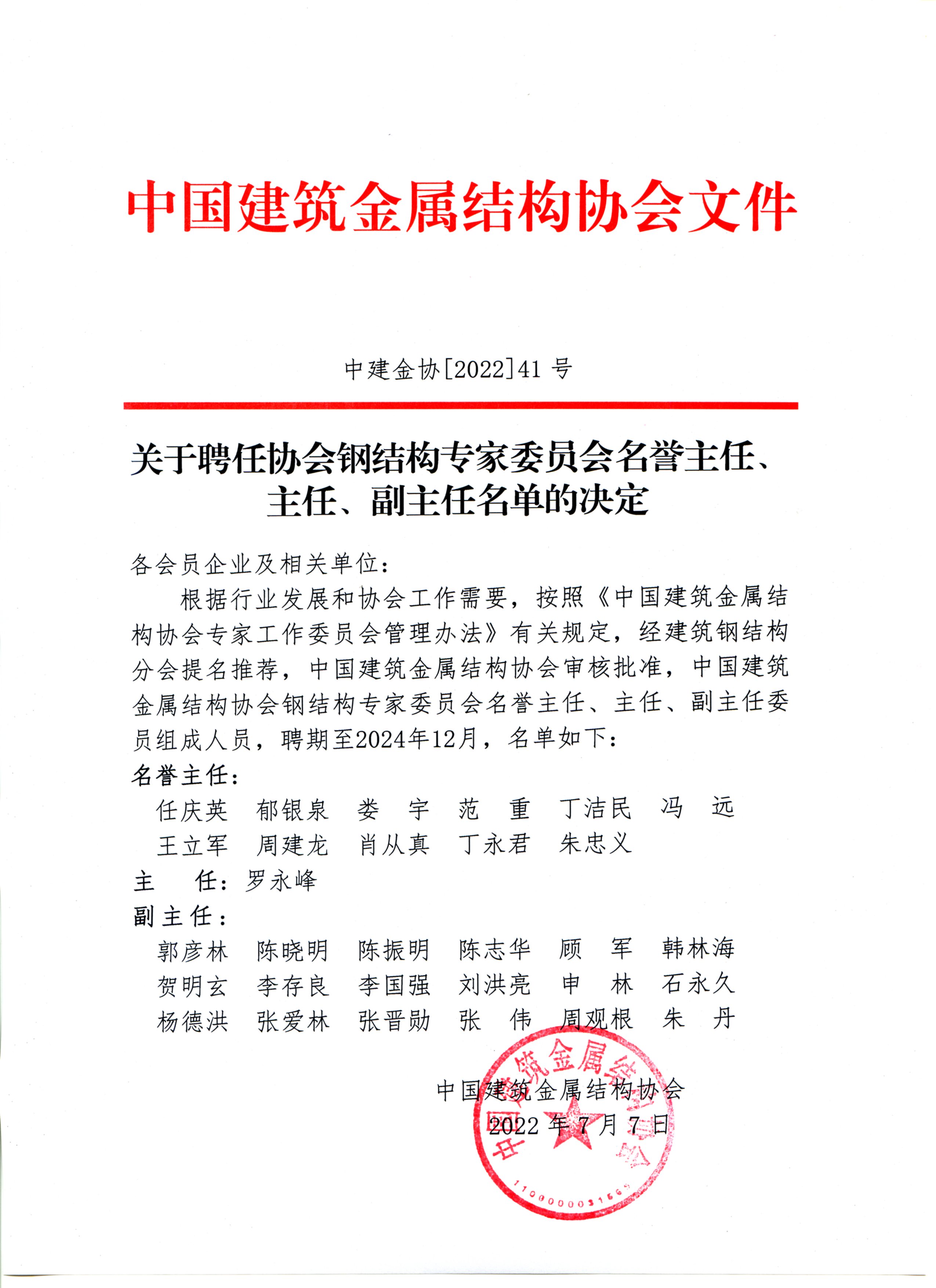 关于聘任协会钢结构专家委员会名誉主任、主任、副主任委员名单的决定