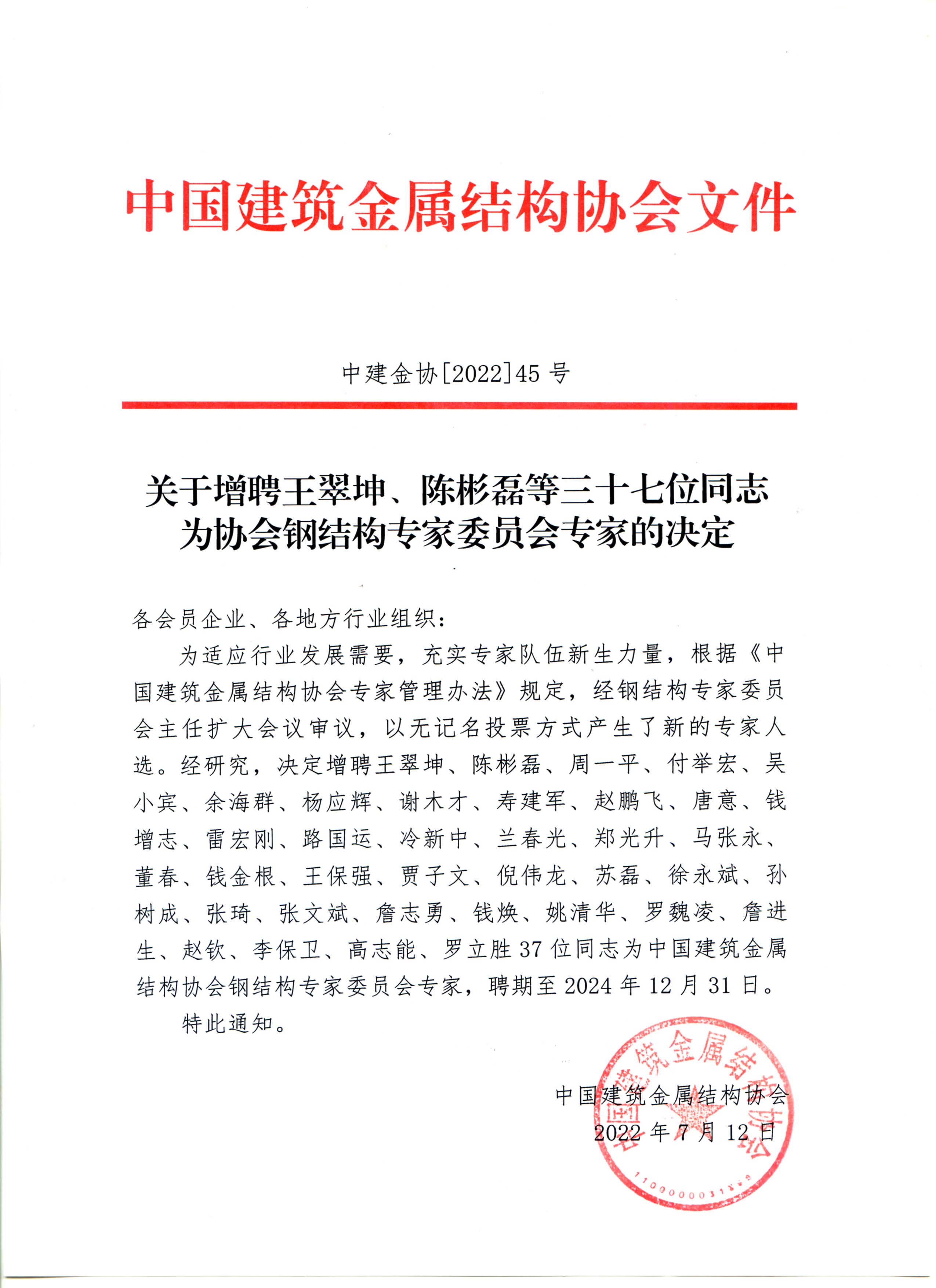 关于增聘王翠坤、陈彬磊等三十七位同志为中国建筑金属结构协会钢结构专家委员会专家的