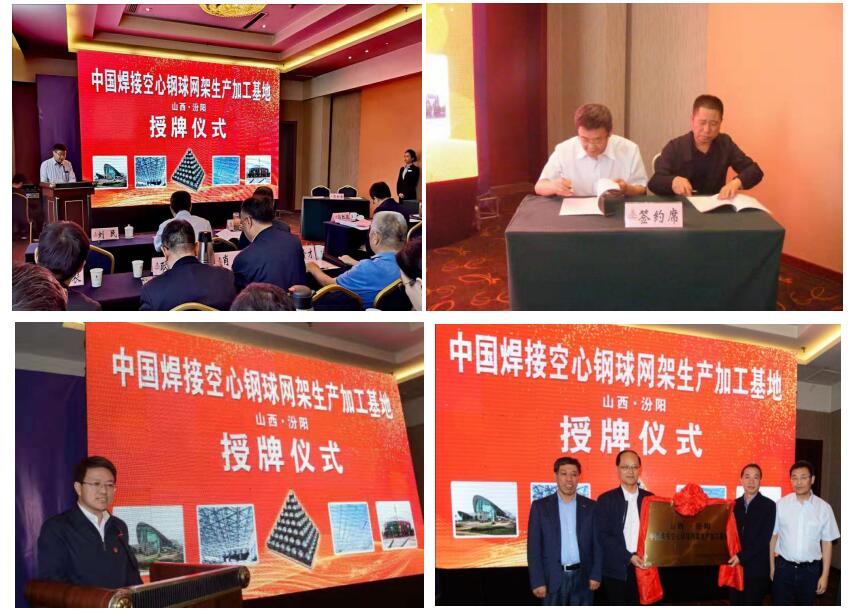 中国建筑金属结构协会建筑钢结构分会副会长刘民主持授牌仪式,协会副秘书长、建筑钢结构分会会长党保卫与汾阳市钢结构协会签定了基地合作共建协议书;协会会长郝际平、副秘书长党保卫、山西省钢结构协会会长李海旺共同为汾阳市创建“中国焊接空心钢球网架生产加工基地”授牌。