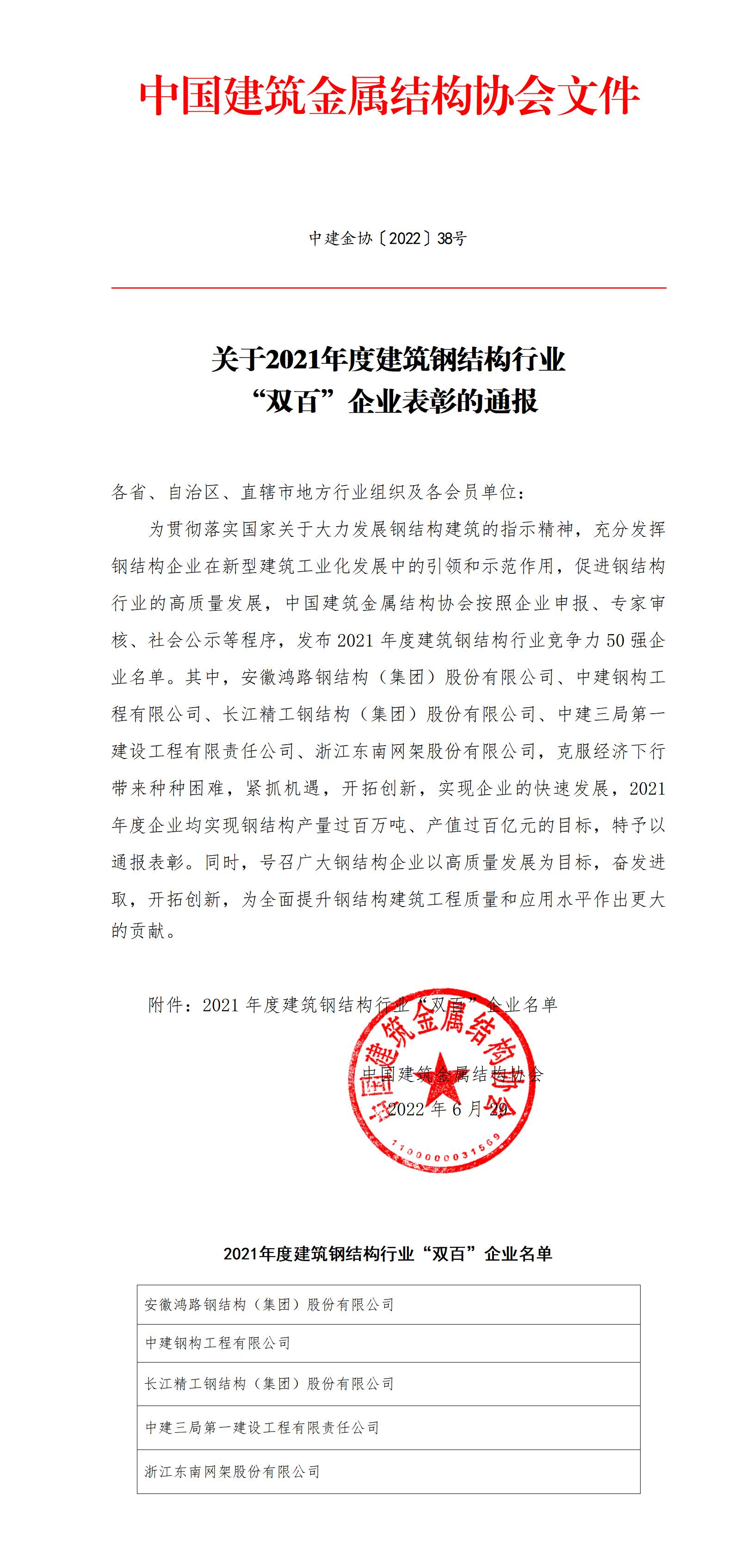 关于2021年度建筑钢结构行业双百企业表彰通报(内附名单)