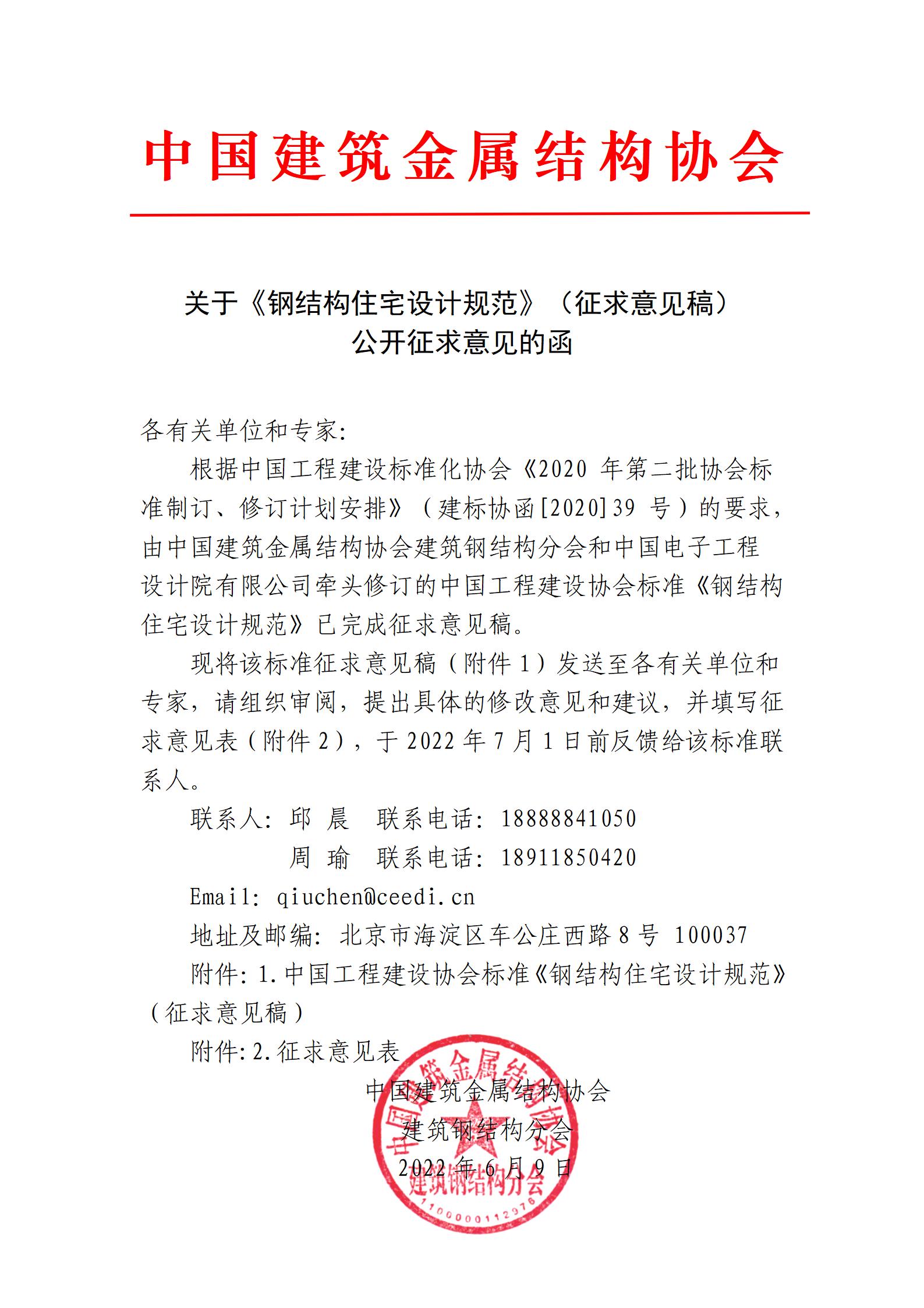 关于 CECS《钢结构住宅设计规范》(征求意见稿)公开征求意见的函