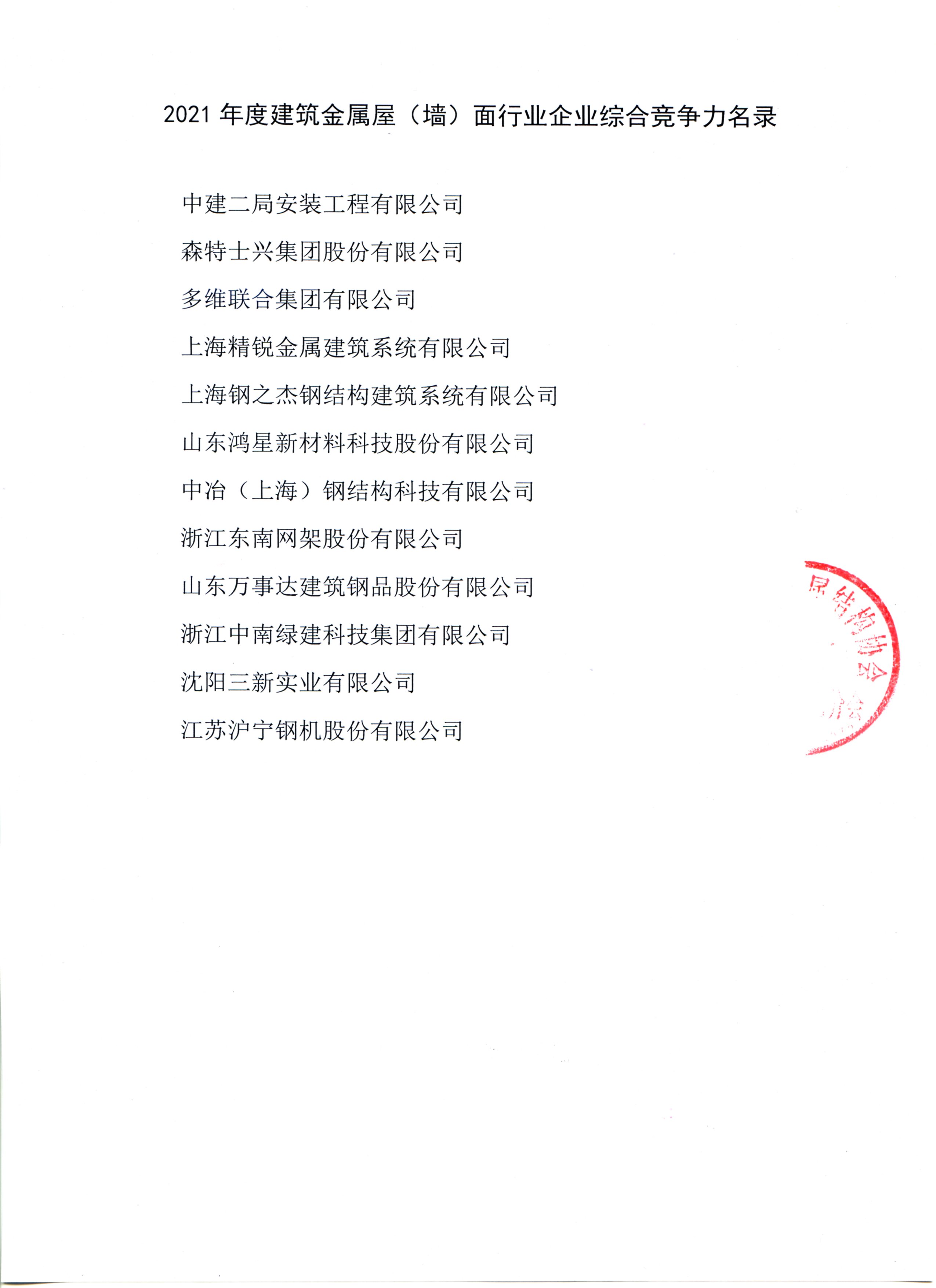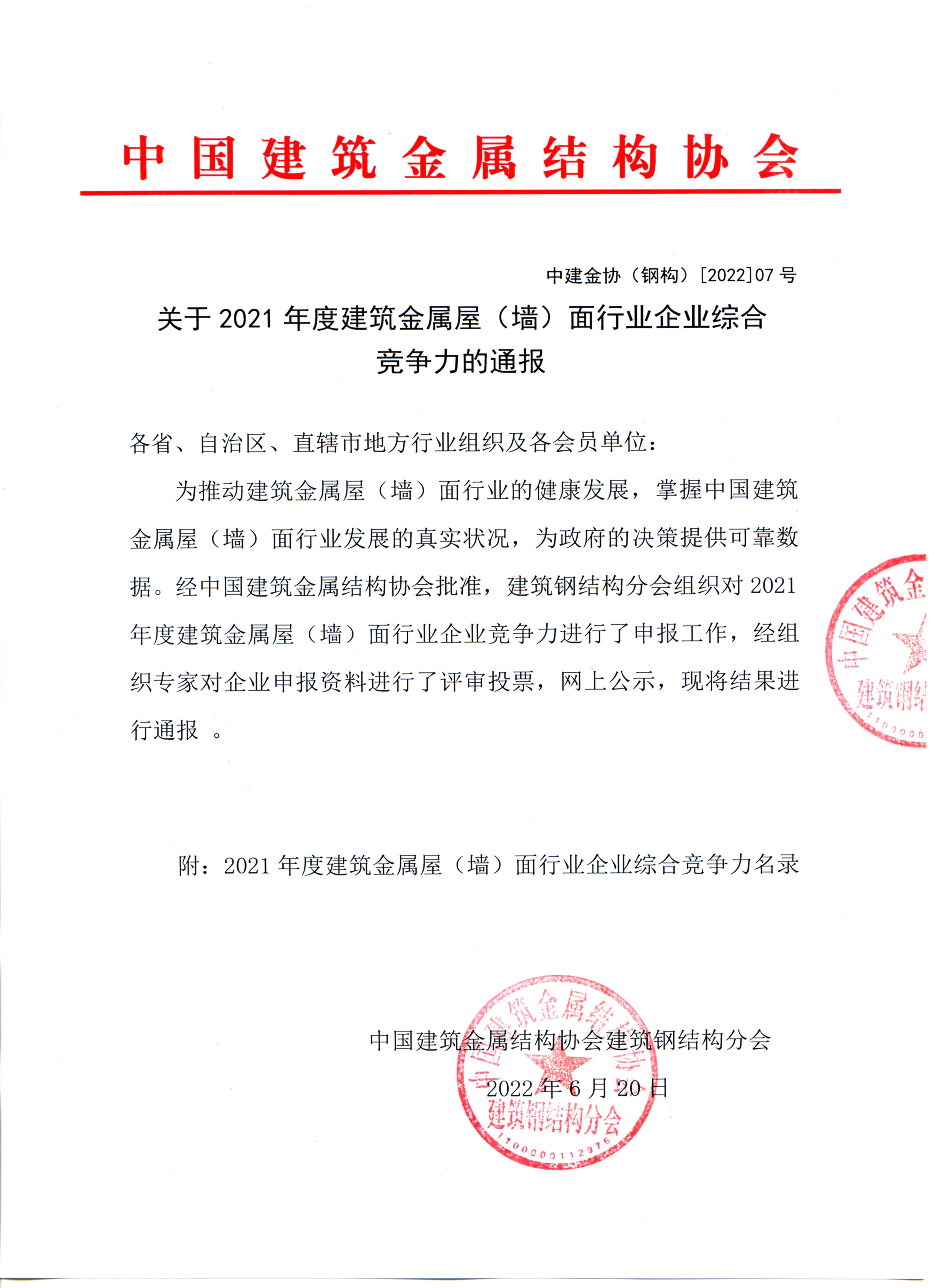 关于2021年度建筑金属屋(墙)面行业企业综合竞争力的通报