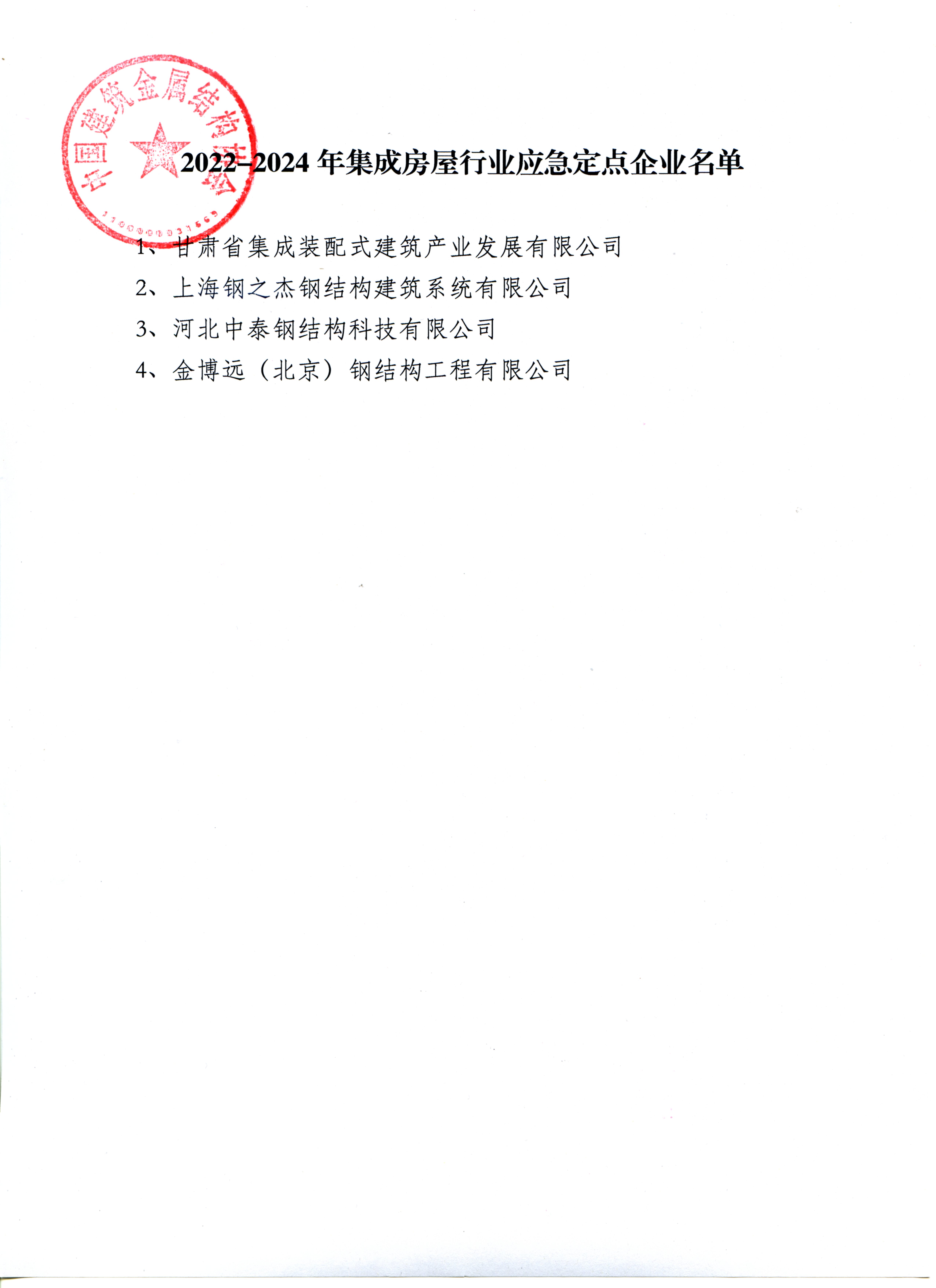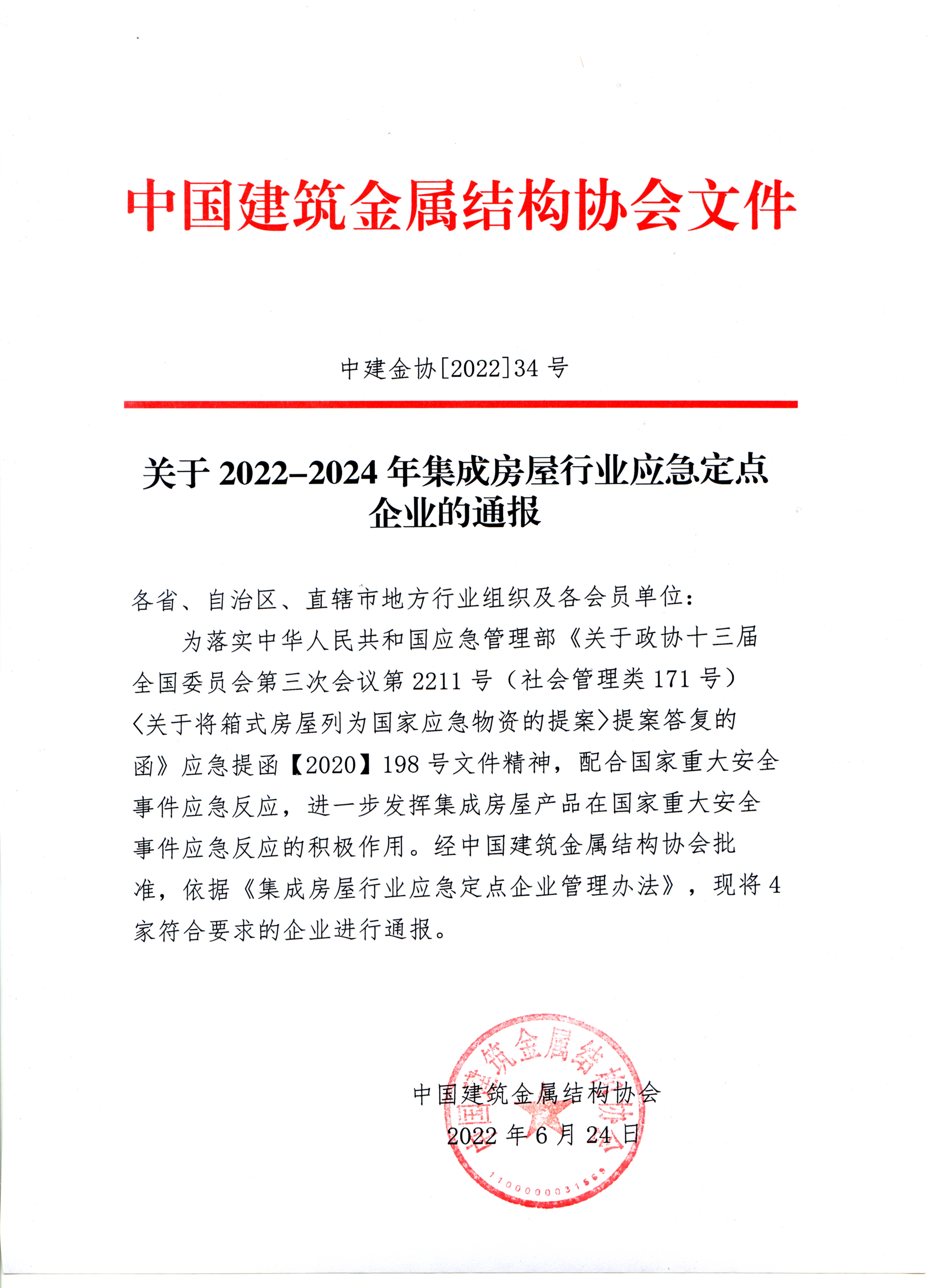 关于2022-2024年集成房屋行业应急定点企业的通报