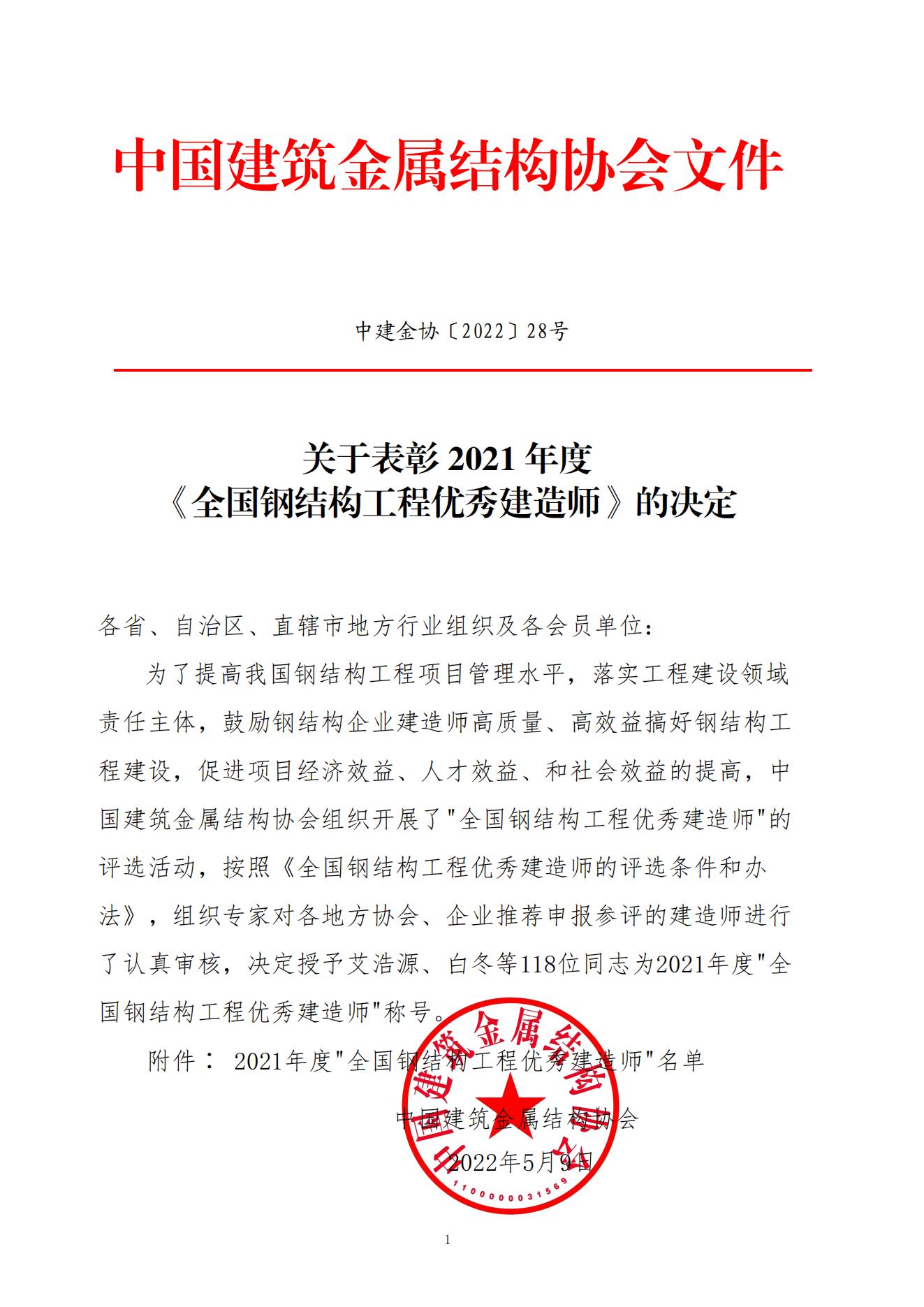 关于表彰2021年度《全国钢结构工程优秀建造师》的决定