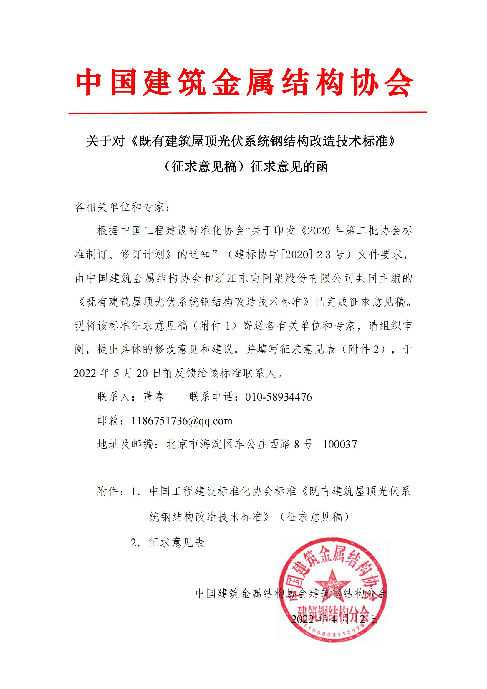 关于对《既有建筑屋顶光伏系统钢结构改造技术标准》(征求意见稿)征求意见的函