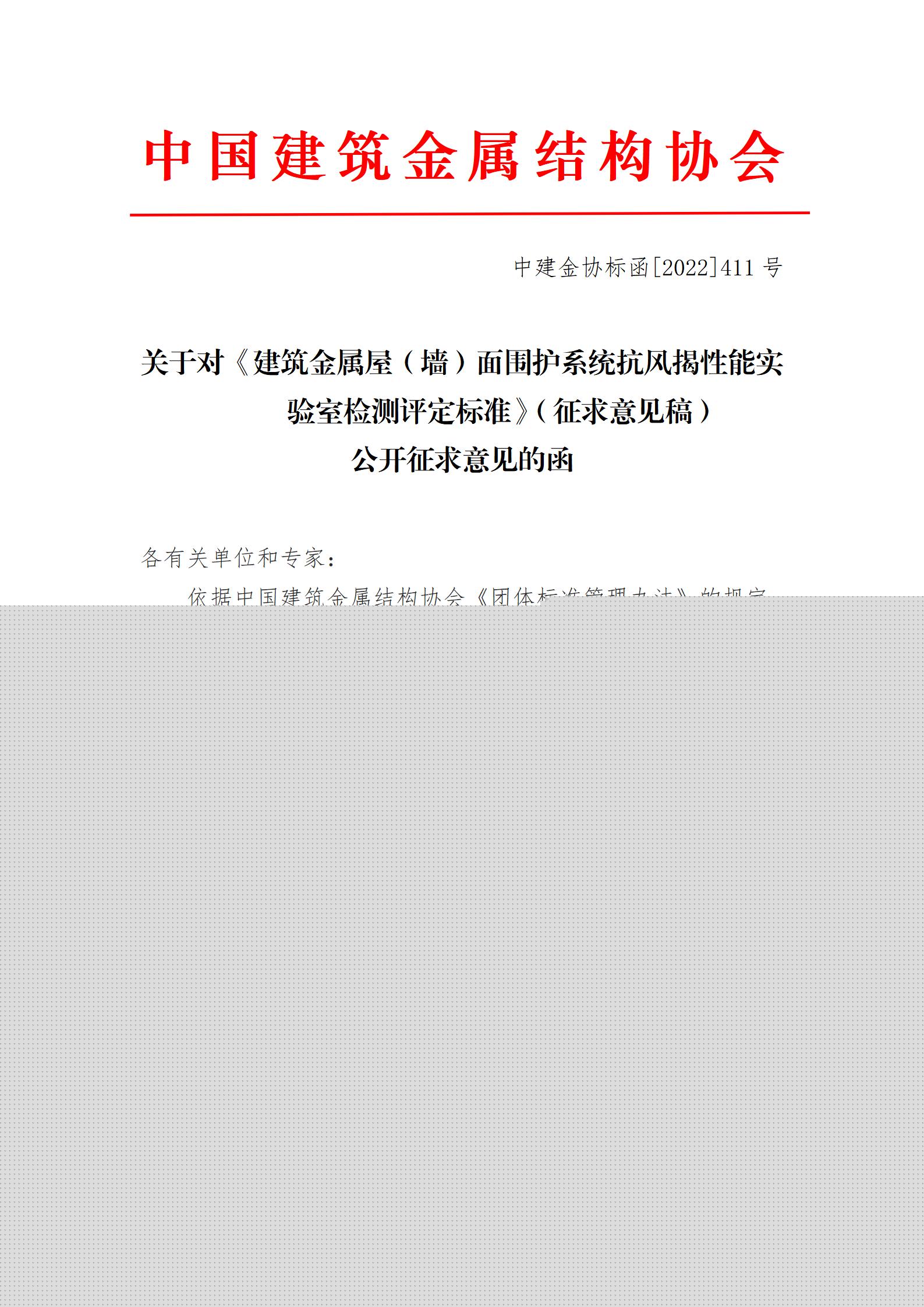 关于对《建筑金属屋(墙)面围护系统抗风揭性能实验室检测评定标准》(征求意见稿)公