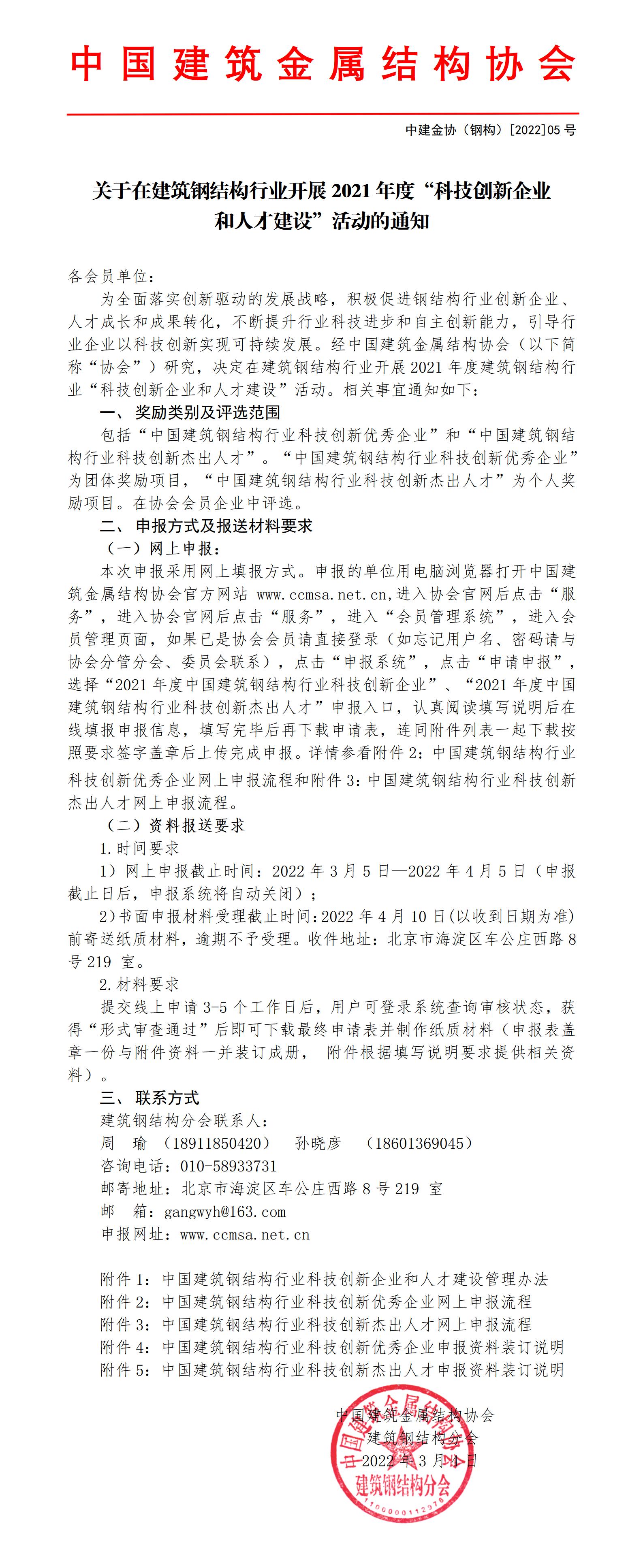 关于在建筑钢结构行业开展2021年度中国建筑钢结构行业科技创新企业和人才建设活动的通知