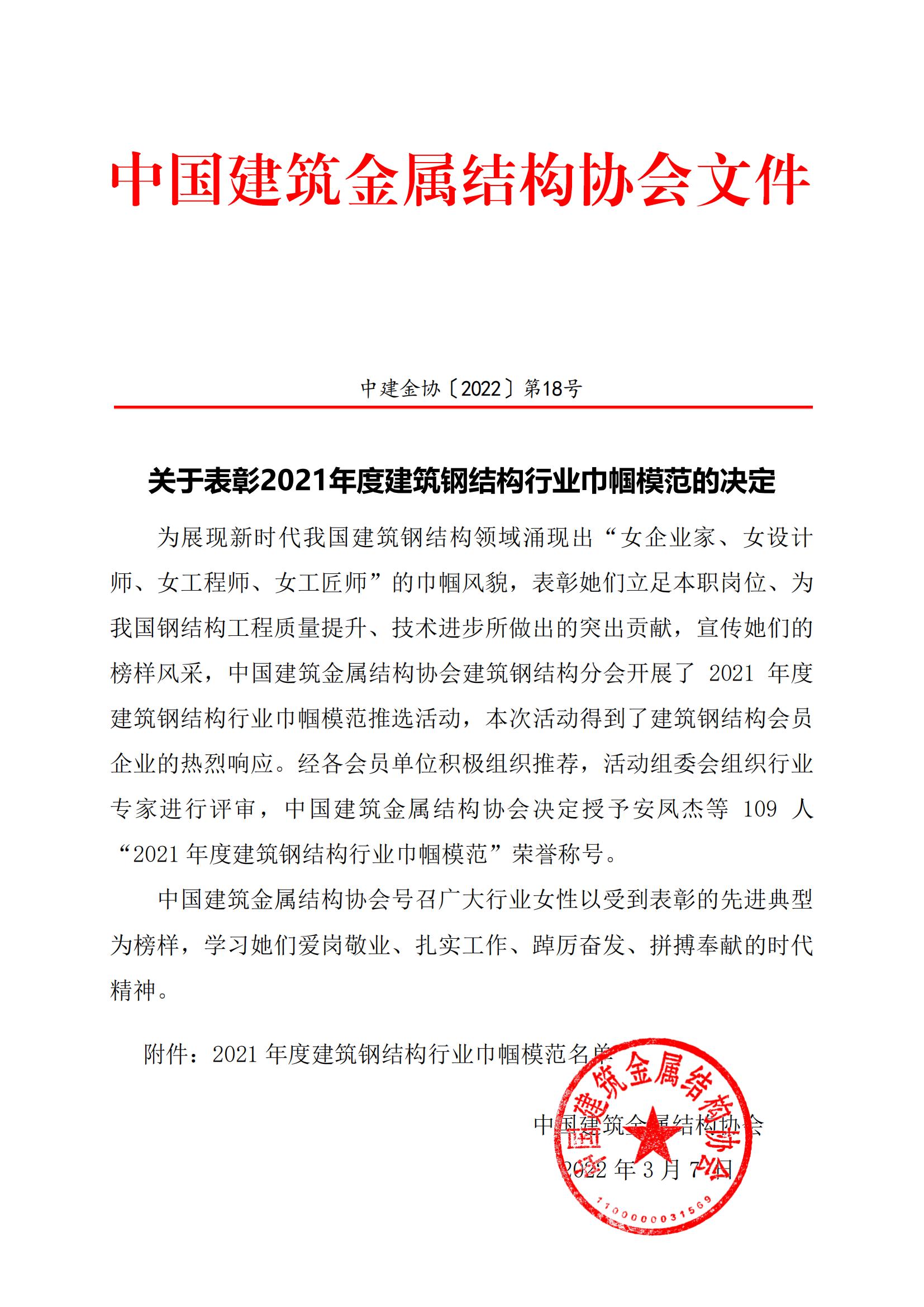 关于表彰2021年度建筑钢结构行业巾帼模范的决定