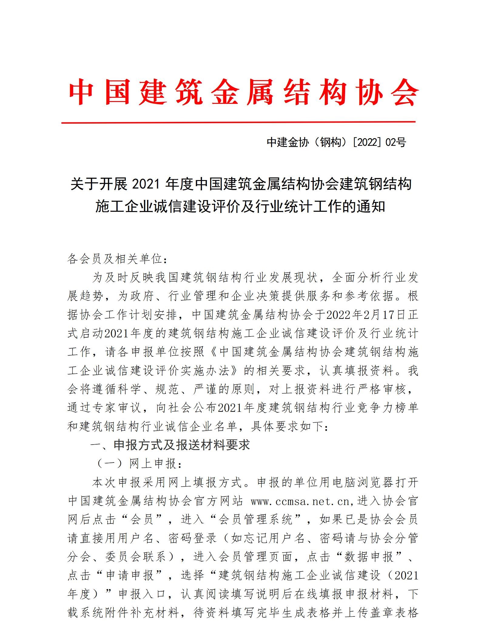 关于开展2021年度中国建筑金属结构协会建筑钢结构施工企业诚信建设评价及行业统计工作的通知