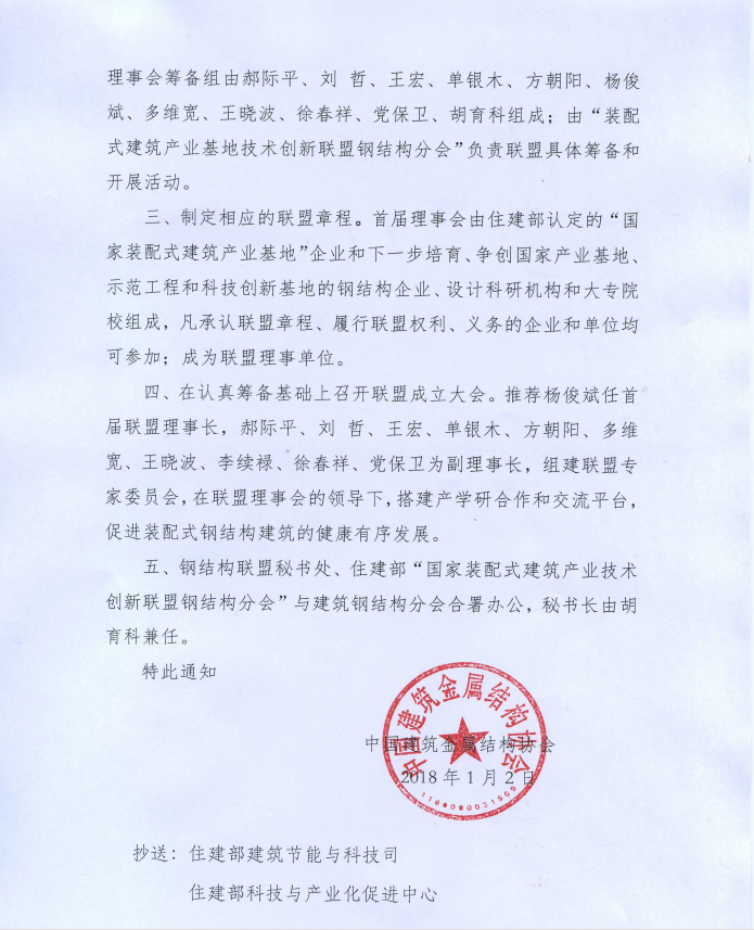 协会也将继续努力做好装配式钢结构建筑技术体系的梳理与研究工作;对企业创新技术体系进行行业内评估与建议,推动行业企业做绿色建筑的示范企业,推动绿色建造发展;引导行业用质量和诚信构建企业品牌,加强行业的质量与诚信建设;利用中国钢结构金奖工程的评审,进行质量创优的培训与示范工程的引领;构建装配式钢结构部品、构配件等工厂生产的行业认证体系及行业的诚信评价体系;编制行业系列团体标准,推动行业的标准化建设。